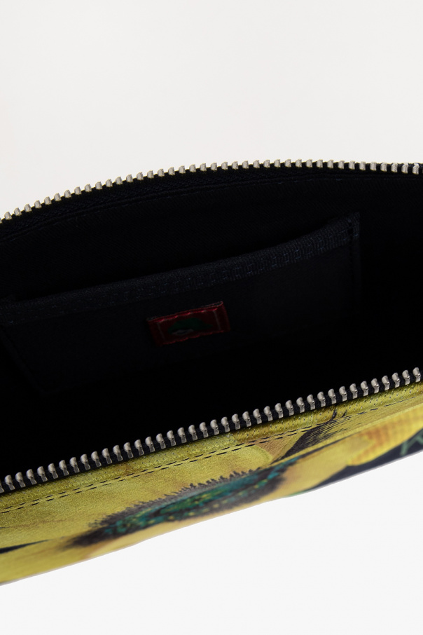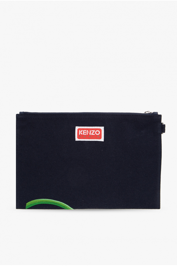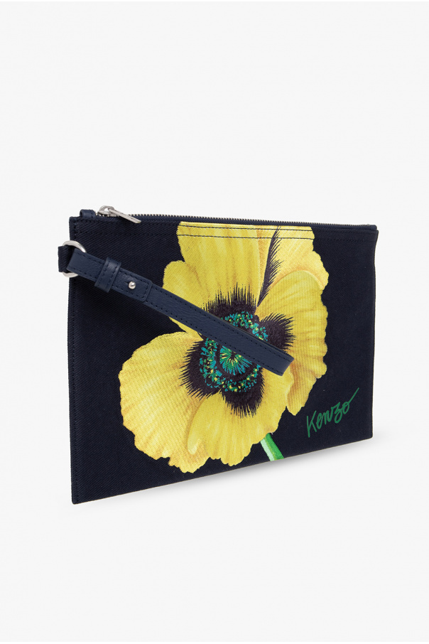 Navy blue handbag from Kenzo. Crafted from cotton, this design fastens via a zipper and showcases colourful KENZO Poppy embroidery on the front. It is complete with a wrist strap on the side, a back logo patch, silver-tone metal hardware and one internal compartment with a card slot.