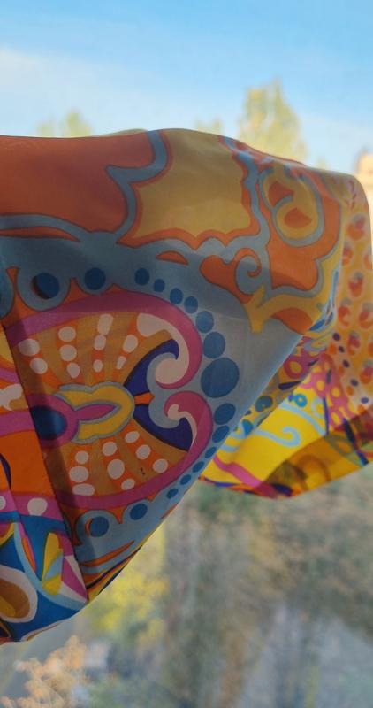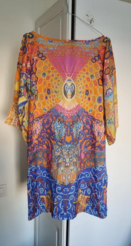 Новое яркое легчайшее платье туника из 100% шелка свободного кроя, без подклада. Способно радовать и повышать настроение себе и окружающим 😀 Не носилось. Без нюансов. Качество швов и ткани на высоте. Tara Jarmon - французский бренд с очень высокими стандартами к качеству и соответственно высокой ценой. Шелк прочный и благодаря насыщенным цветам практически не просвечивает, см. последнее фото на свету, цвет на фото реальный. Прямой крой от проймы, рукав начинается от горловины. Можно с тонким поясом носить. Можно даже как блузу, с юбкой большей длины. А можно и по купальник на пляж 🌴. Размер FR 38 на бирке. Европейский 36 S. Пог 48 поб 52 Задумано носиться свободным, поэтому, несмотря на замеры, будет идти на полноценную S хорошо, на М уже будет меньше струиться. ХS будет более свободно. Горловина широкой лодочкой, с узких покатых плечей женственно может немножечко приоткрывать одно плечо. Люблю 💓этот бренд за женственные образы и идеальное качество ткани и шитья, платье куплено для себя, к сожалению, не подошло мне по цветовой гамме.