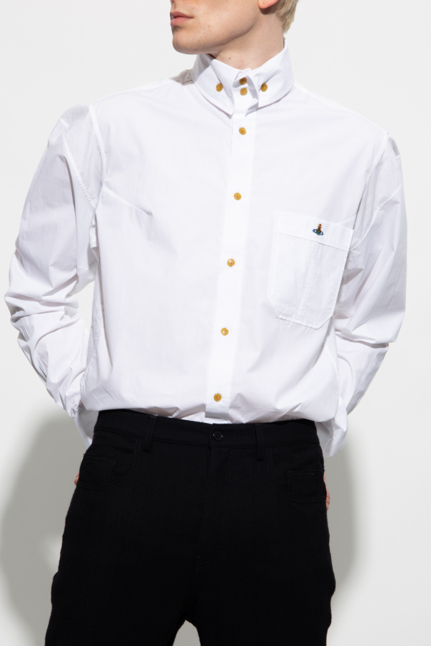 White shirt from Vivienne Westwood. Made of cotton, this style features beige buttons, a slip chest pocket embroidered with a colourful logo, and long sleeves with turn-up cuffs and button closures.