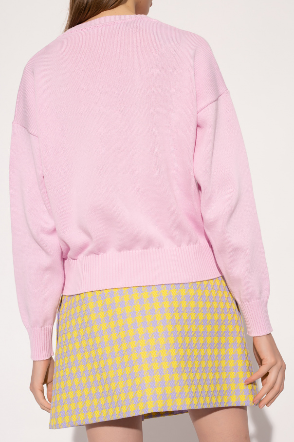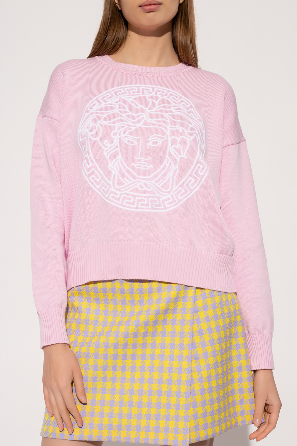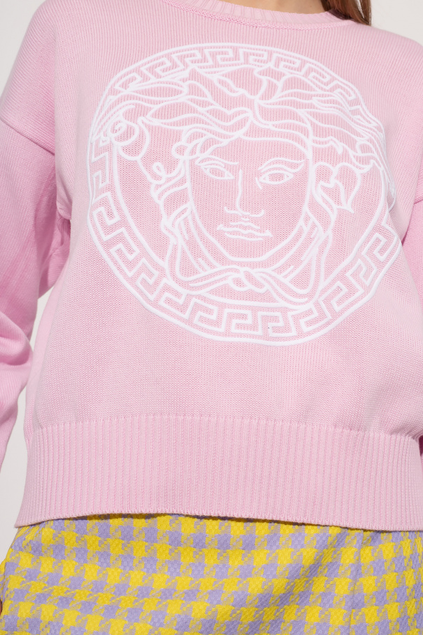 Pink sweater from Versace. Made of cotton, this garment features an embroidered white pattern and ribbed trims at the neck, hem and cuffs.