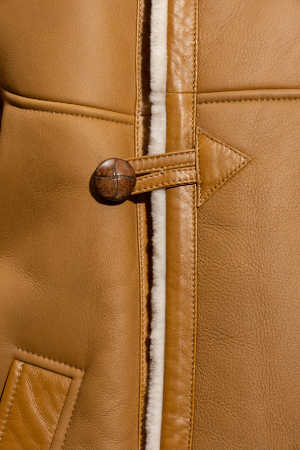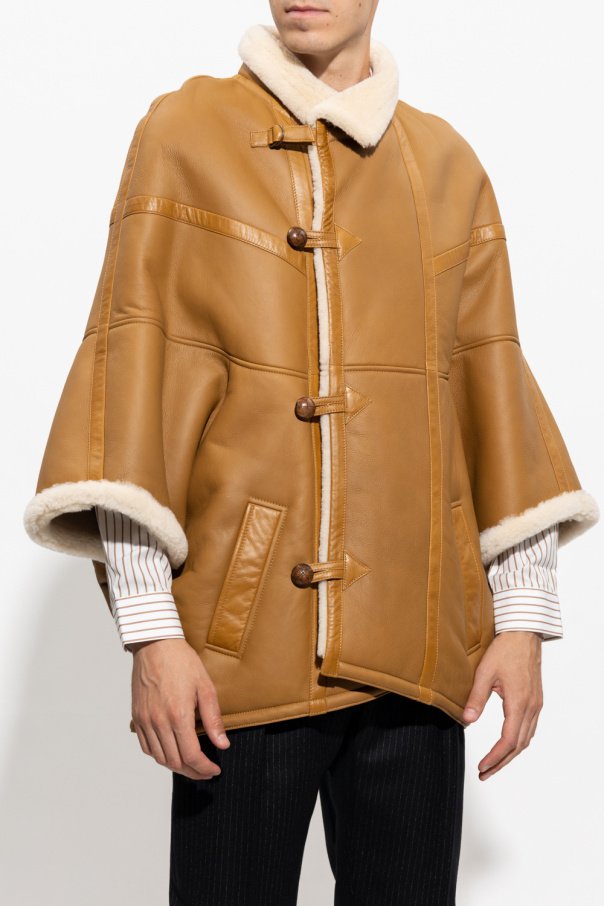 Light brown poncho from Saint Laurent. Made of a blend of sheep and lamb leather with sheep fur, this design feature a collar with strap fastening, decorative buttons and two slip pockets.