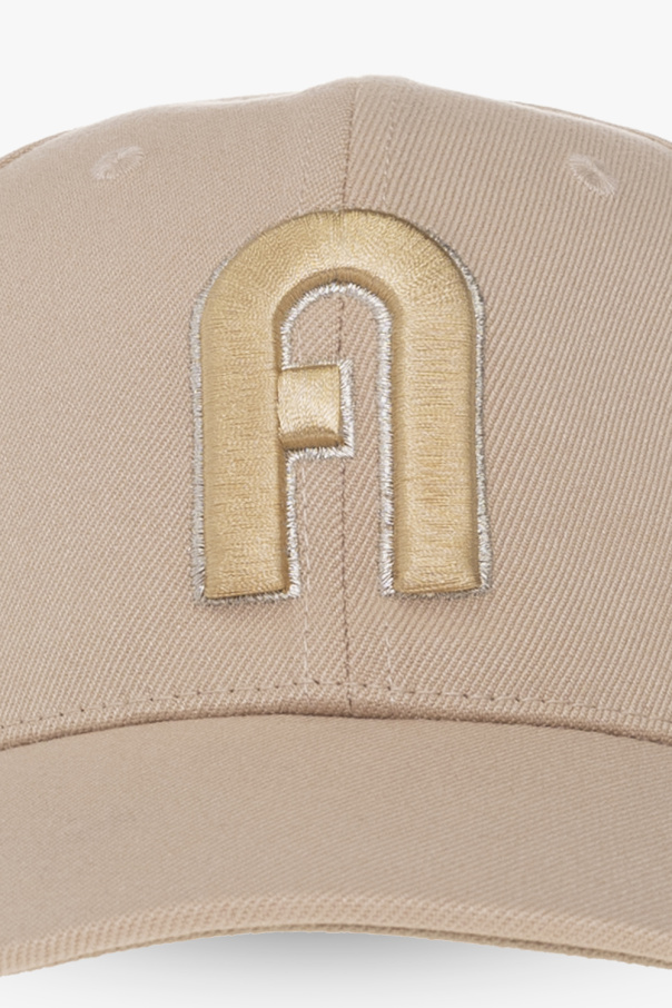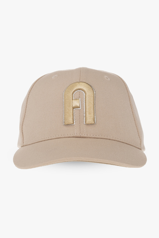 Beige baseball cap from Furla. Embroidered at front with a gold-tone and silver-tone logo, this item features a buckle adjuster at the back.