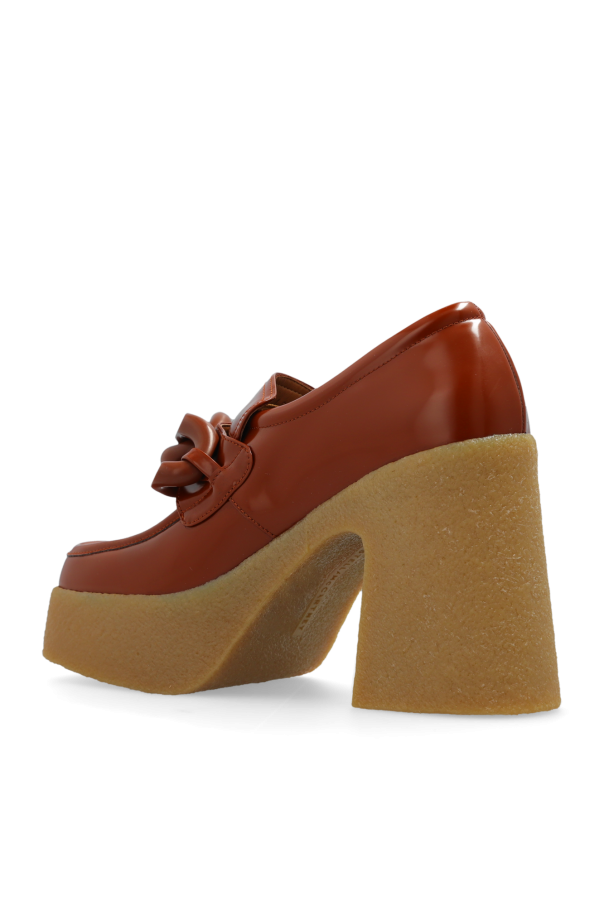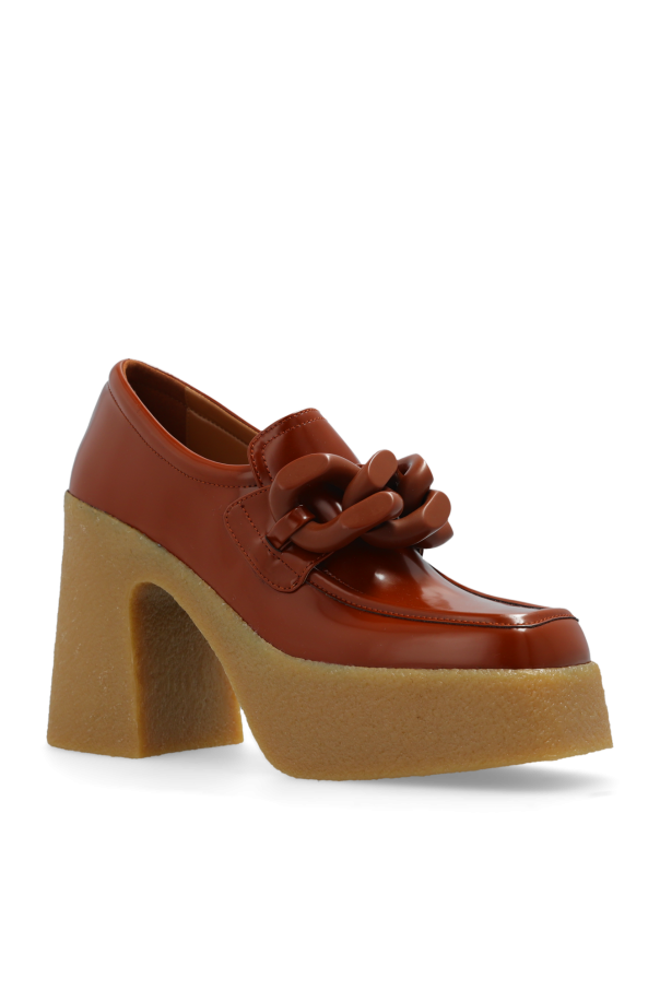 Brown platform shoes from Stella McCartney. Crafted from vegan leather, this model sits on a beige rubber sole and showcases chain link hardware on the front.