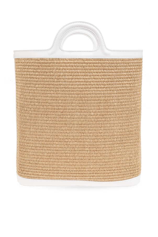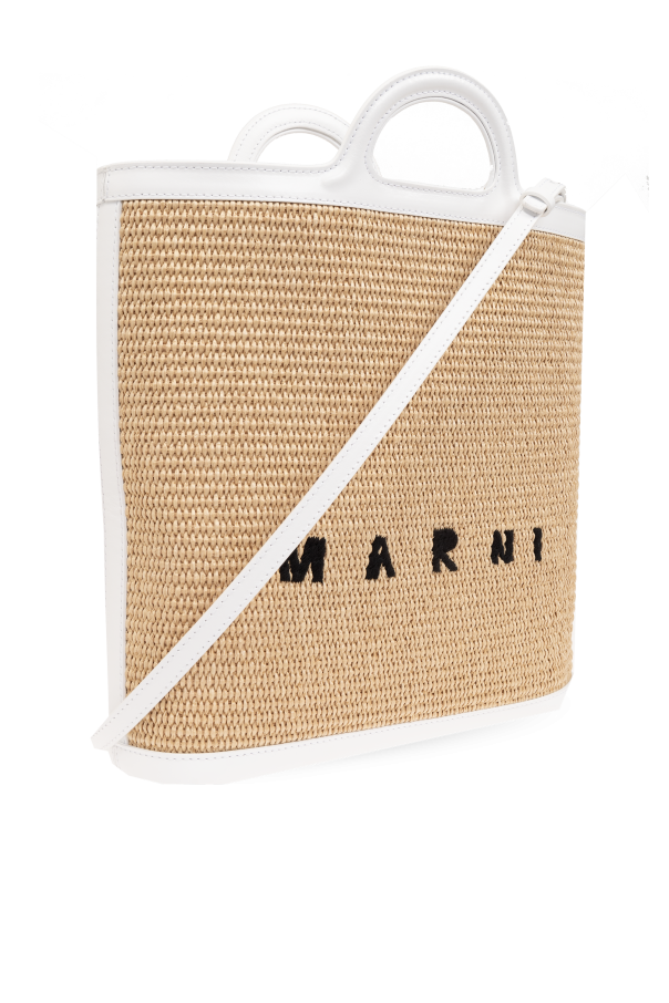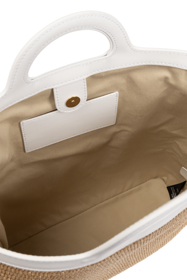 Introducing the \'Tropicalia\' shoulder bag by Marni, a masterpiece of craftsmanship that marries functionality with high-end style. This exquisite piece stands out with its rectangular shape, softened by rounded upper corners and a flat bottom that ensures stability and grace in any setting. Crafted from a blend of cotton, polyamide, and calf leather, the bag\'s exterior boasts a natural and textured look reminiscent of woven raffia, rendered in a sophisticated beige hue. The front features the iconic MARNI logo in bold black letters, creating a striking contrast that immediately catches the eye. The bag is equipped with two sturdy white handles and a detachable, adjustable shoulder strap in a crisp white, adding a touch of elegance against the beige body. Metallic elements in a lustrous gold tone not only secure the strap but also enhance the bag\'s luxurious appeal. Inside, the bag reveals a lining in a complementary golden or beige material, maintaining a harmonious color scheme throughout. A magnetic snap closure, detailed with a gold-toned button, secures your belongings with ease, while precise stitching and high-quality materials underscore the exclusive nature of this accessory. Why Purchase This Product? Exquisite craftsmanship from renowned designer Marni. Unique blend of materials, including woven raffia and calf leather, offers both durability and style. Functional design with a magnetic snap closure and an interior compartment for card storage. Detachable and adjustable shoulder strap provides versatile carrying options. Elegant metallic accents in gold tone add a refined finish.