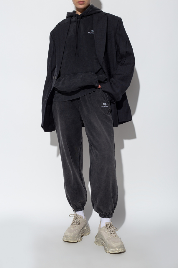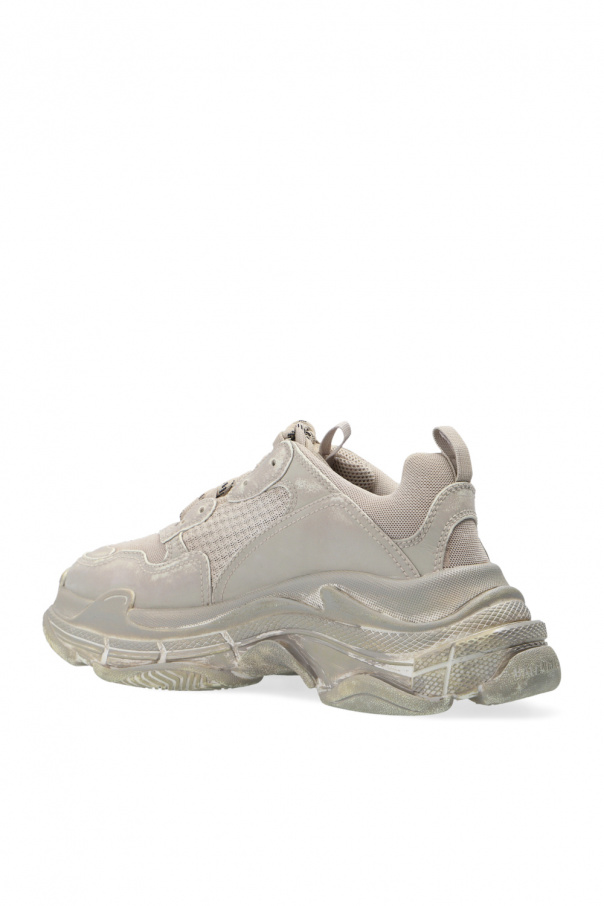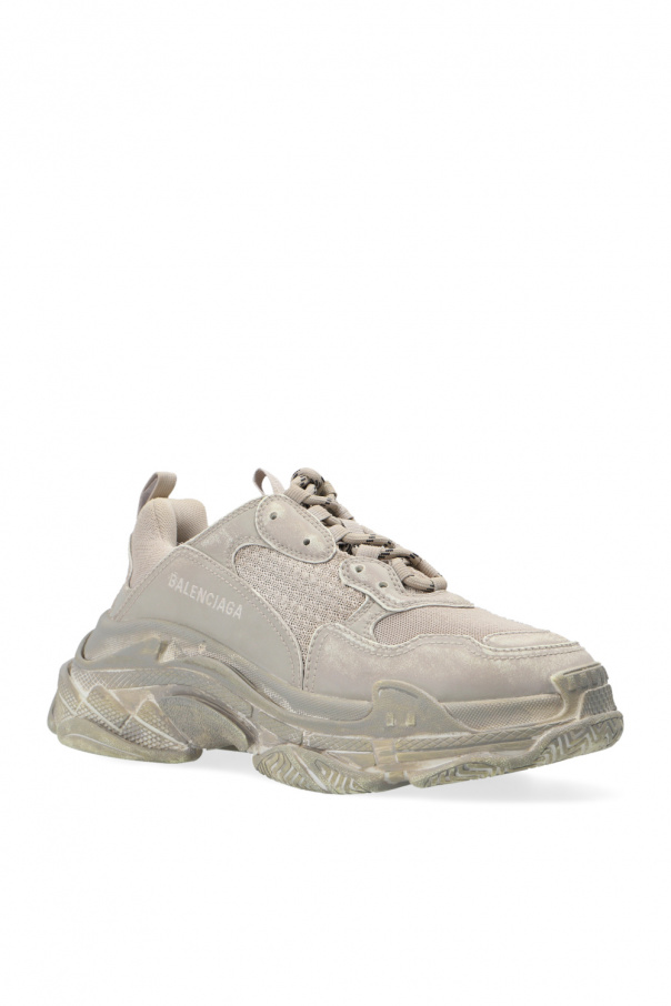 Grey and cream ‘Triple S’ sneakers from Balenciaga. Crafted from leather, this lace-up model sits on a white, grey and cream rubber sole and features logo detailing and a distressed treatment.
