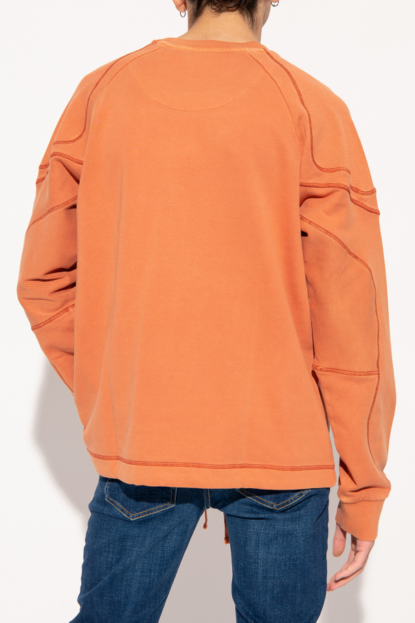 Orange ‘S-Ribal’ crewneck sweatshirt from Diesel. Made of cotton from sustainable farms, this style features ribbed inserts, a distinctive seam, a white and black logo patch on the sleeve, a drawcord-adjustable hem and rib-knit trims on the collar and cuffs.