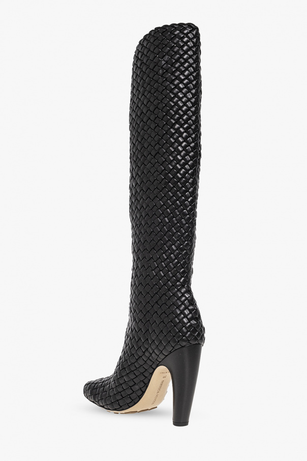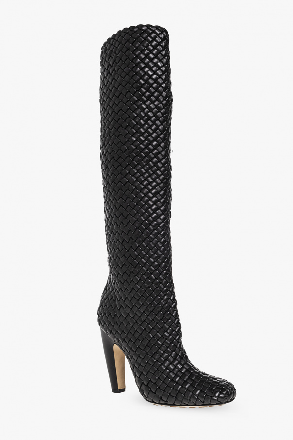 Black ‘Canalazzo’ heeled boots from Bottega Veneta. Crafted from lamb leather with the brand’s signature Intrecciato weave, this pair is set on a light beige leather sole with rubber elements for increased traction.