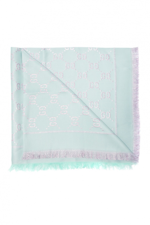 Blue and purple shawl from Gucci Kids. Crafted with the use of wool and synthetic yarns, this accessory showcases logo pattern, embroidered with lurex yarn, and short fringes.