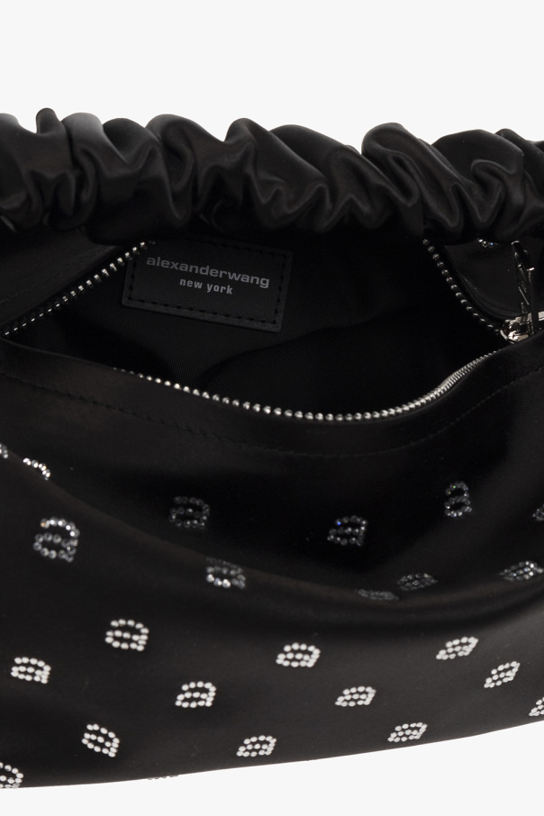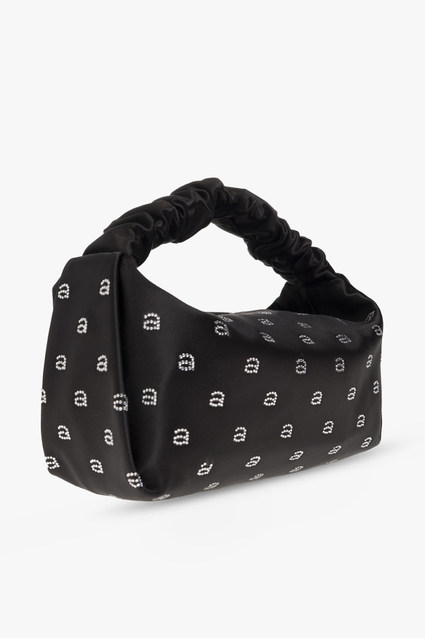 Black ‘Scrunchie Mini’ handbag from Alexander Wang. Cut from satin, this model is complete with a zip fastening, monogram pattern embellished with crystals, decorative stretch handle with gathers, one internal compartment and silver-tone metal hardware.
