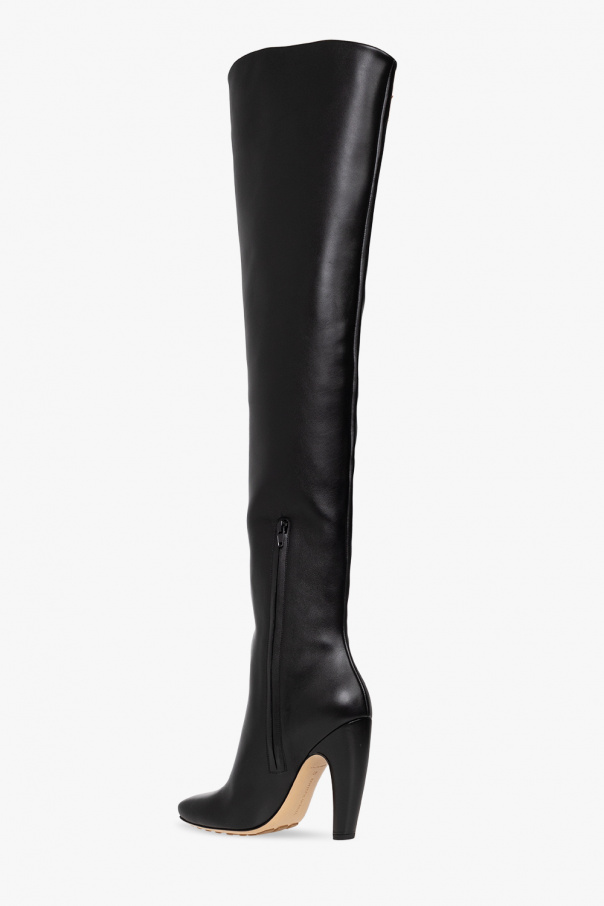 Black ‘Canalazzo’ heeled boots from Bottega Veneta. Crafted from calf leather, this thigh-high design features a side zip, round toe and light beige rubber-injected leather sole providing an increased grip.
