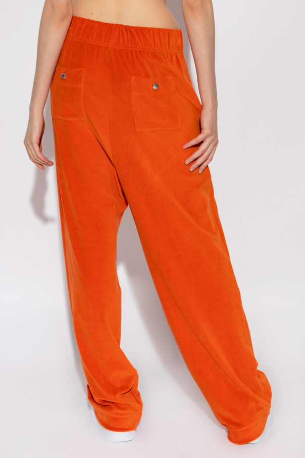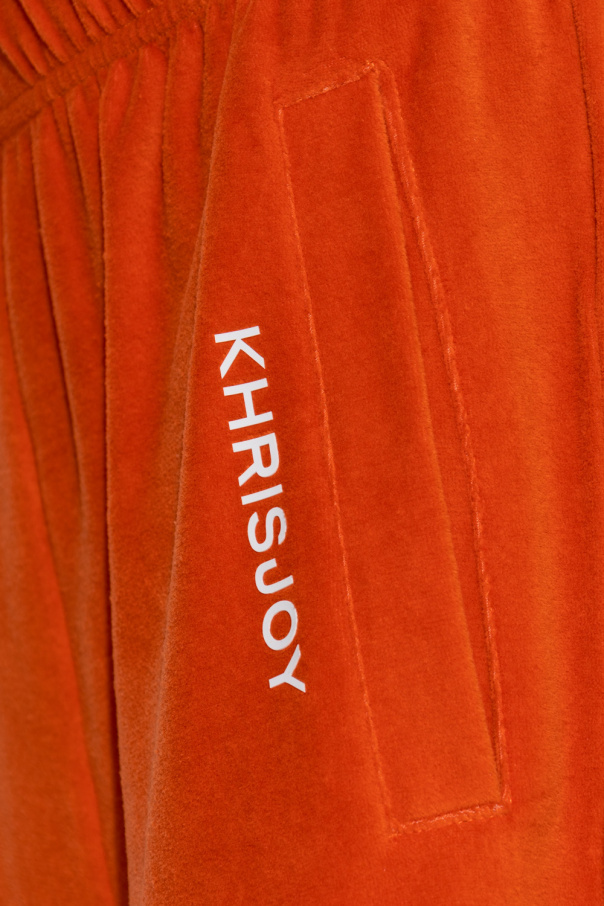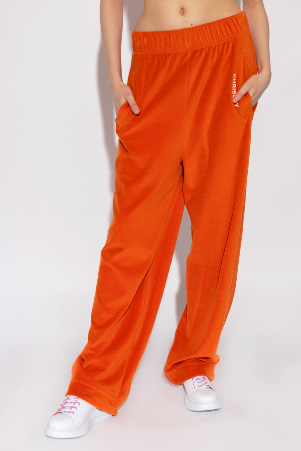 Orange sweatpants from Khrisjoy. Made of cotton velour, this pair features an elastic waistband, white logo print, two front pockets, one snap-fastened back pocket and loose-fitting straight legs.