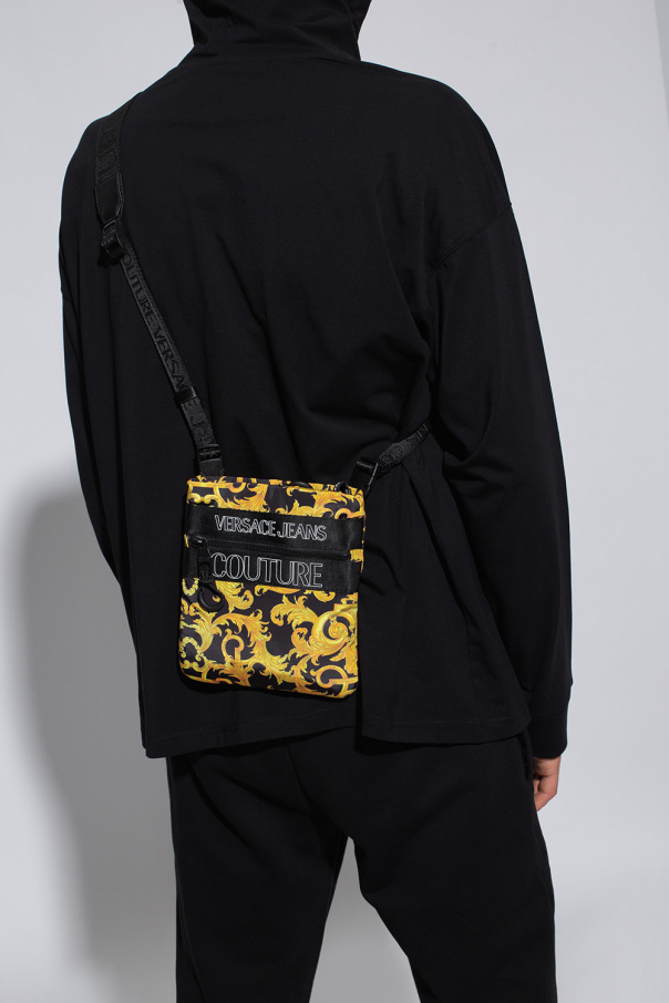 Black shoulder bag from Versace Jeans Couture. Embellished with the brand\'s signature Barocco print in yellow with an accompanying logo in white, this design fastens via a zip and features a zip pocket on the front, an adjustable shoulder strap and one internal compartment with one slip pocket and one zip pocket.