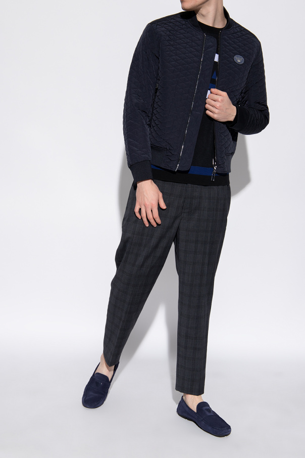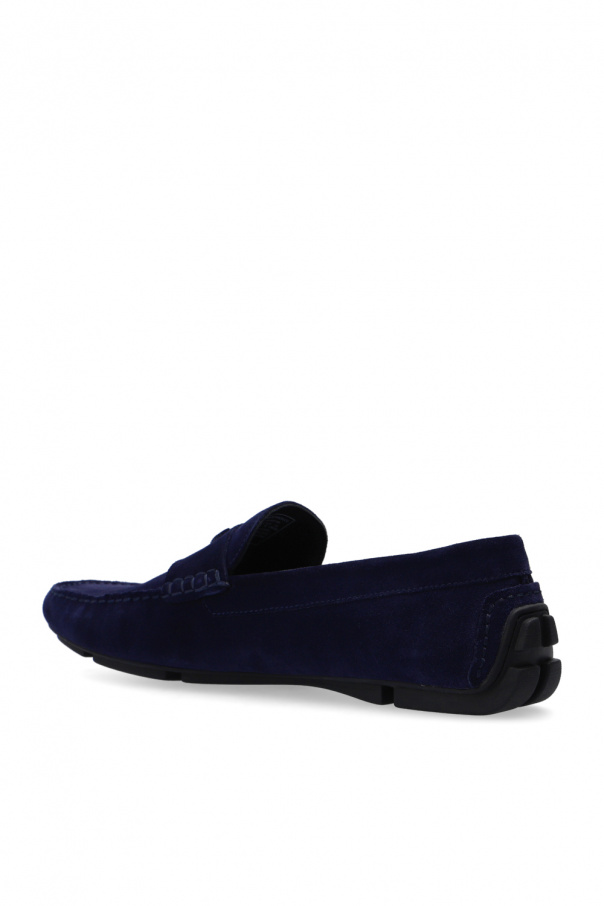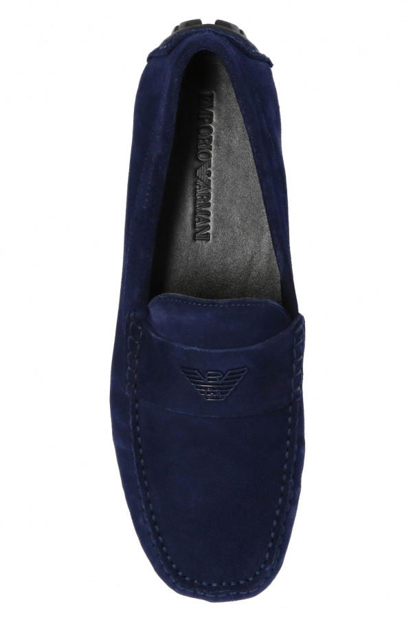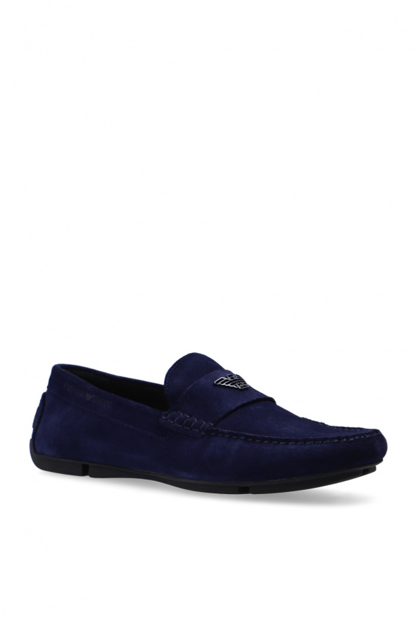 Navy blue moccasins from Emporio Armani. Crafted from suede, this model sits on a black rubber sole and showcases a tactile logo application.