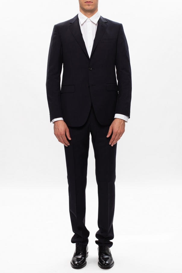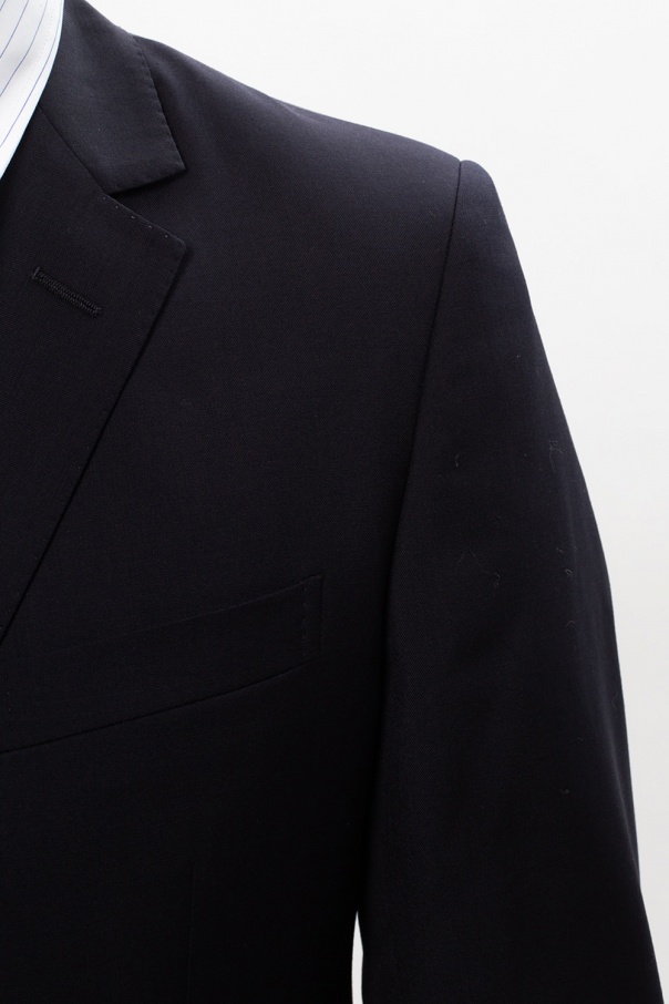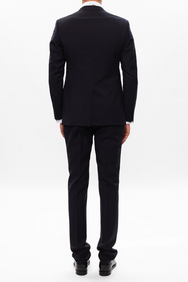 Black suit from Lanvin. Crafted from wool, this set includes a blazer with button fastening, slip pocket, two flap pockets and single rear vent as well as trousers with four slip pockets and zip, hook and button fastenings.
