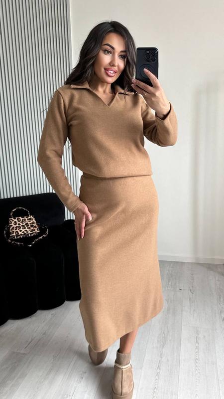 ‼️ Условия покупки читать в описании магазина Костюм женский с удлиненной юбкой выполнен из мягкой качественной ткани. Отлично стилизовывать с разными видами обуви. Подойдет как для повседневности так и для событий в вашей жизни. Ткань Ангора вязка плотная Цвет черный, молочный, мокко, кэмел Размер 42-44,46-48,50-52 Цена 630 грн Костюм юбка длина миди, талия на резинке, книзу расширяется Кофта с воротником, рукав длинный. хар 365