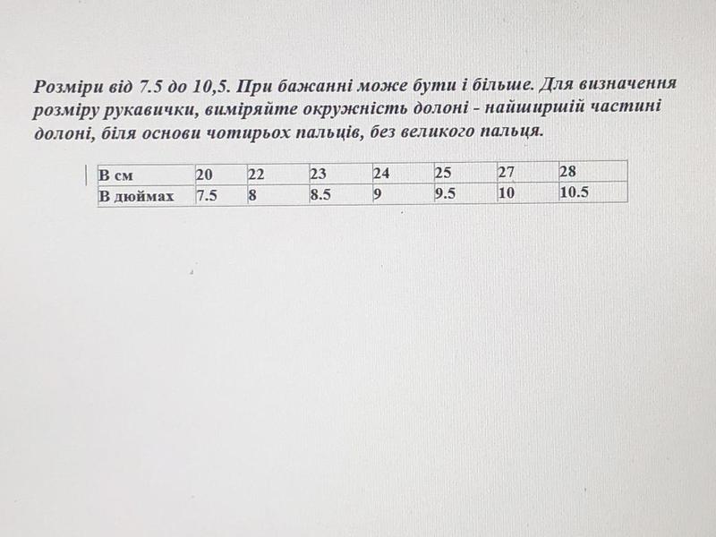 Рукавички шкіряні тактичні. Виготовлені з натуральної шкіри. Дана модель має посилену накладку на долонній частині з натуральної шкіри - замш, що поліпшує захват зброї або утримання чого небудь. На тильній частині додаткові захисні накладки, які слугують для пом'якшення ударів і захистом від можливих пошкоджень. Манжетна частина для більш надійної фіксації, регулюється липучкою. Рукавички виготовлені в місті Вінниця на Шкіргалантерейній фабриці. Яка більш ніж 25 років виготовляє рукавичні вироби.. Розміри від 8 до 10,5. При бажанні може бути і більше. Для визначення розміру рукавички, виміряйте окружність долоні - найширшій частині долоні, біля основи чотирьох пальців, без великого пальця. В см 20 22 23 24 25 26 27 28 В дюймах 7.5 8 8.5 9 9.5 9 3/4 10 10.5