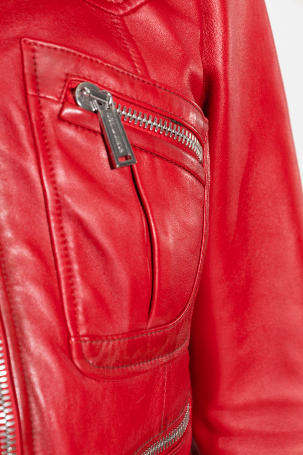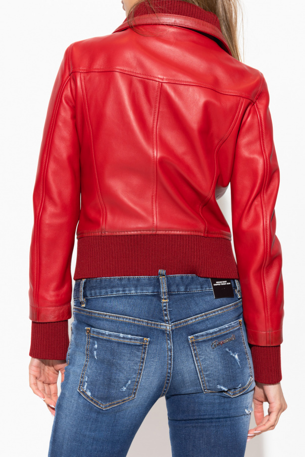 Red jacket from Dsquared2. Made of sheep leather with a slightly vintage effect, this style secures with a two-way zip and features a high-neck collar, four zip pockets and elasticized trims on the edges.