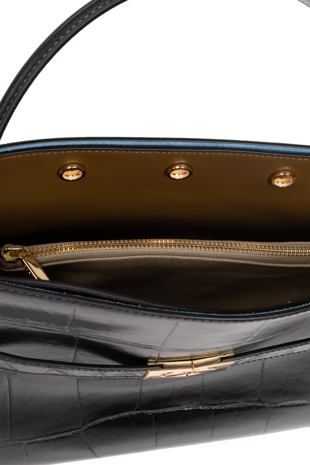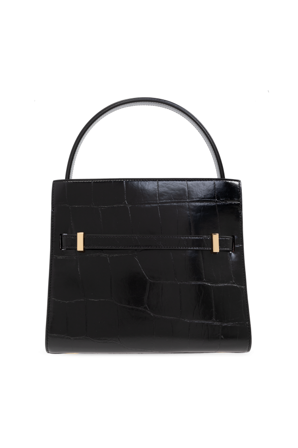 Introducing the Lee Radziwill Small handbag by Tory Burch, a paragon of sophistication and timeless elegance. This exquisite piece is meticulously crafted to embody the essence of luxury. The handbag features a classic, rectangular silhouette with rounded edges and a single, semi-circular handle, perfect for effortless carrying. Its exterior, crafted from high-quality leather that mimics crocodile skin, exudes an exclusive allure. The design is accentuated by a decorative strap with a gold-tone clasp on the front, elegantly showcasing the designer\'s logo. The interior, lined with a light fabric, includes two zipped pockets and a slip pocket, all secured by three golden magnetic closures. The dominant black color renders this handbag both elegant and timeless, while the detachable shoulder strap, finished with contrasting stitching, offers versatile styling options. Why Choose This Product? Impeccable craftsmanship with refined finishes Luxurious gold-tone accents for a sophisticated touch Versatile design suitable for formal and casual occasions High-quality leather exterior and light fabric interior Ample storage with two zipped pockets and a slip pocket Detachable shoulder strap for versatile wearing options