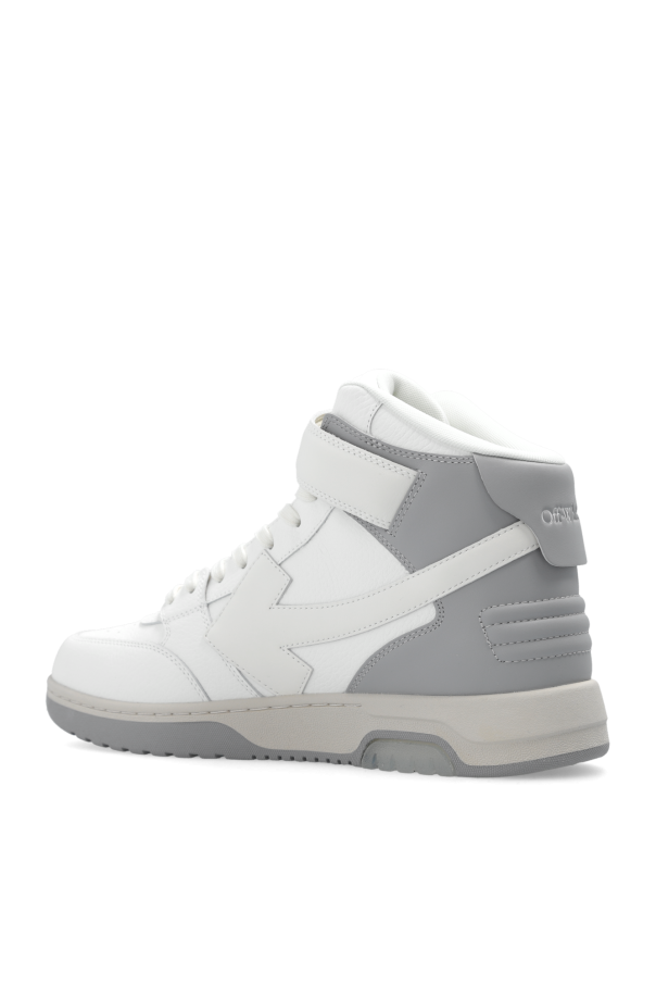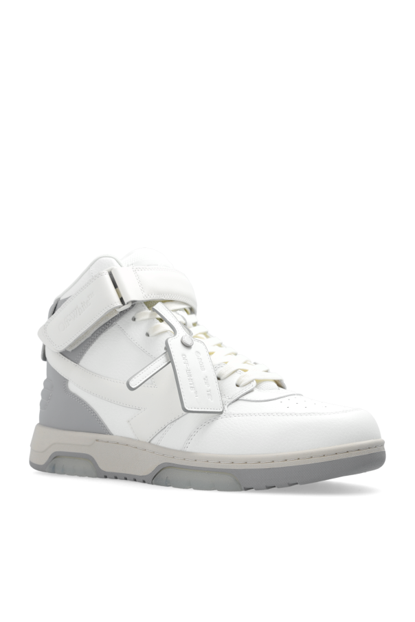 White and grey ‘Out Of Office’ high-top sneakers from Off-White. Made of leather with fabric trims, this lace-up pair features a logo-embossed velcro fastening, perforated front, the brand’s signature arrow on the side, embossed logo at the back, zip tie tag and rubber sole in cream and grey.