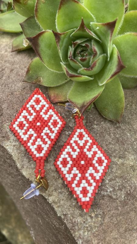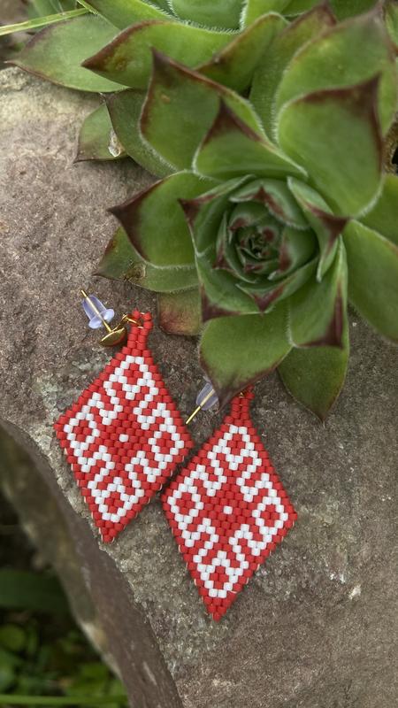 Серьги-ромбы с орнаментом выполнены из качественного японского ювелирного бисера. Сверху - металлическая швенза в форме сердца. Легкие, красивые и необычные. Отлично подойдут к празднично образу или на подарок.