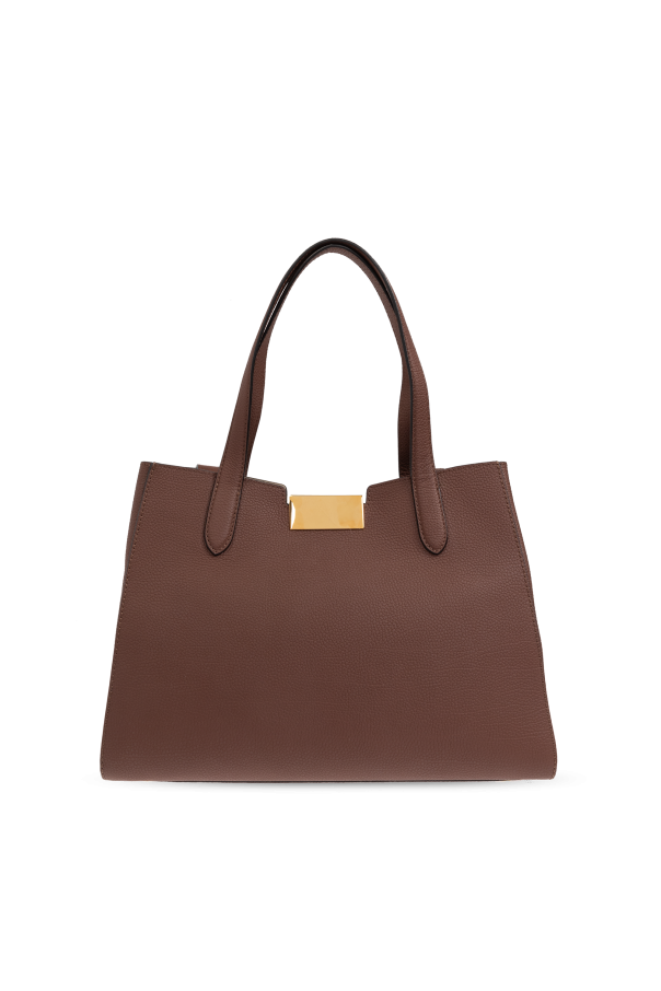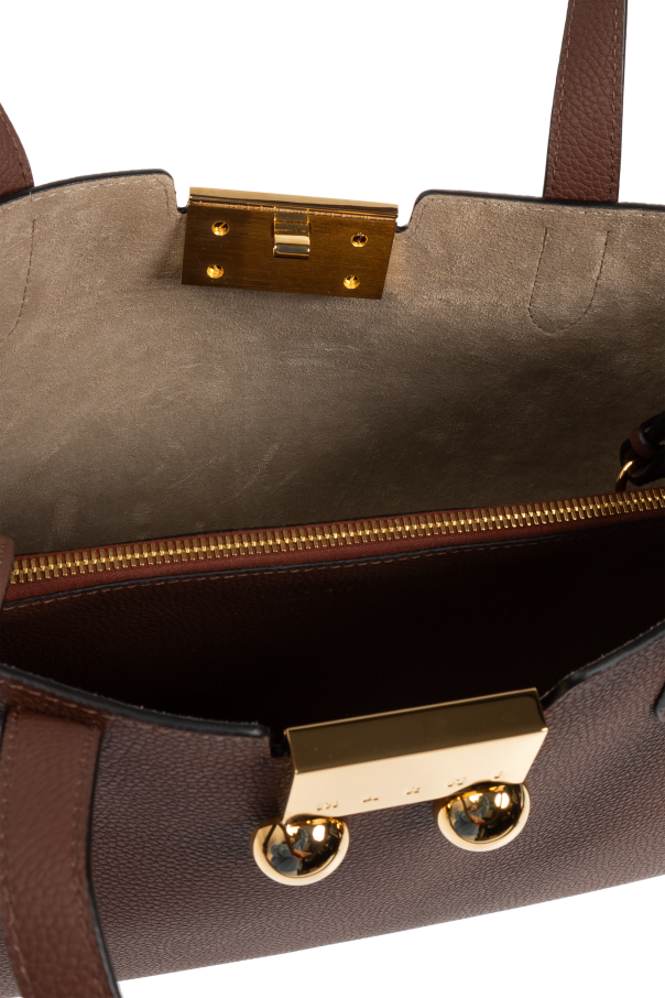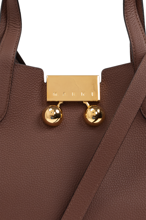 Introducing the ‘Trunkaroo’ Shopper Bag by the illustrious Marni. This exquisite accessory is a testament to the brand\'s dedication to sophistication and craftsmanship. The bag is adorned in a refined brown hue, crafted from premium pebble-textured calfskin leather, ensuring both elegance and durability. The rectangular silhouette with structured sides offers a timeless aesthetic, complemented by dual hand-carry handles and an additional shoulder strap for versatile wear. A gold-toned clasp embellished with ornamental spheres and a rectangular plaque engraved with the designer\'s logo enhances its luxurious appeal. Inside, a light-hued interior secured by a zipper promises the safety of your essentials. Thoughtfully designed, it features a main compartment and a zippered pocket for optimal organization. This bag seamlessly blends functionality with elegance, making it perfect for both everyday use and more formal occasions. Why Choose This Product? Crafted from high-quality calfskin leather for longevity. Features a classic rectangular shape with versatile carrying options. Luxurious details include a gold-toned clasp and engraved logo. Secure interior with a main compartment and zippered pocket. Designed by the renowned Marni, known for its eclectic and daring designs.