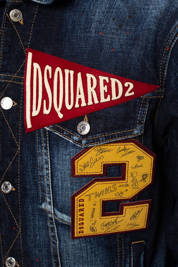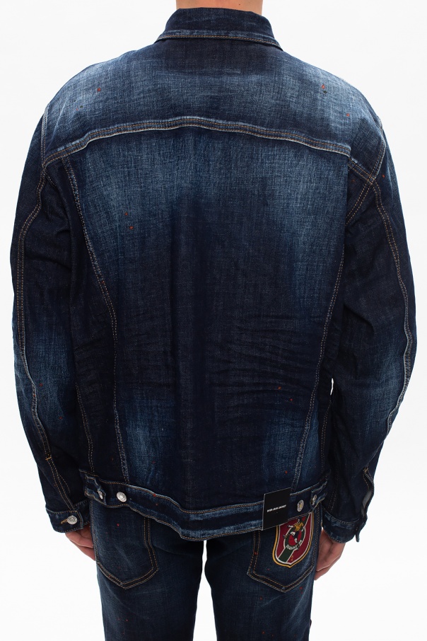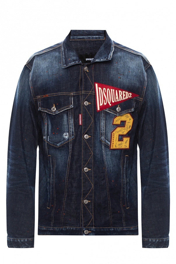 Navy distressed denim jacket from Dsquared2. Fastened with buttons, this design features red, yellow and white logo patches, two slip pockets and two flap pockets with buttons.