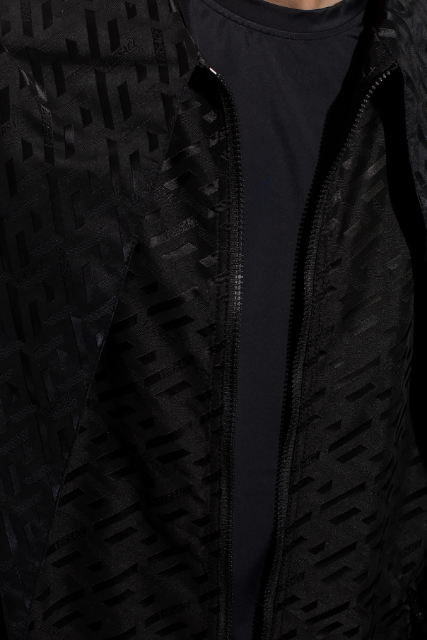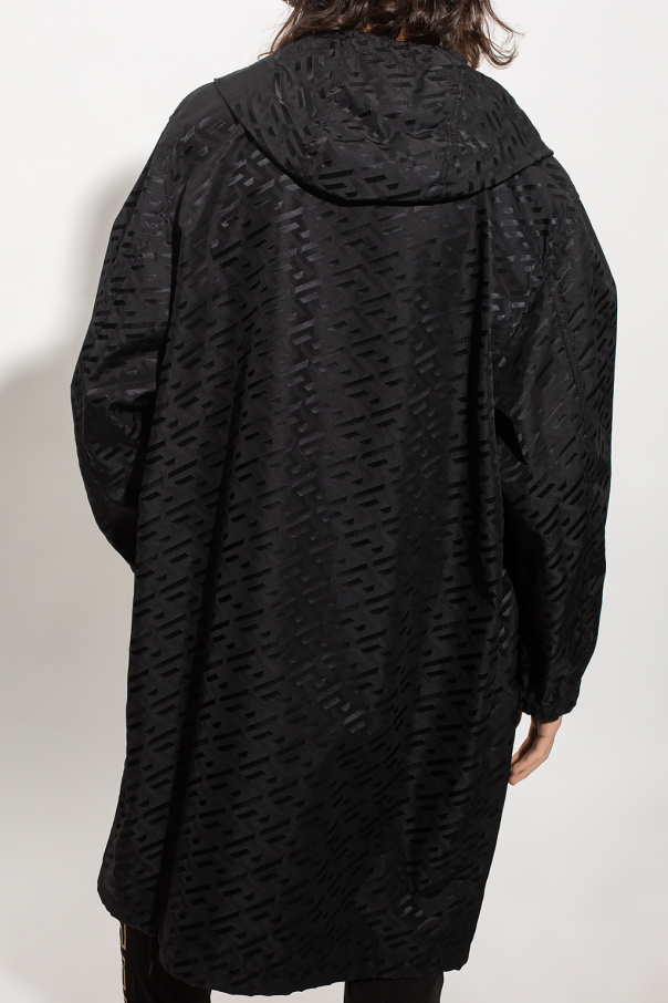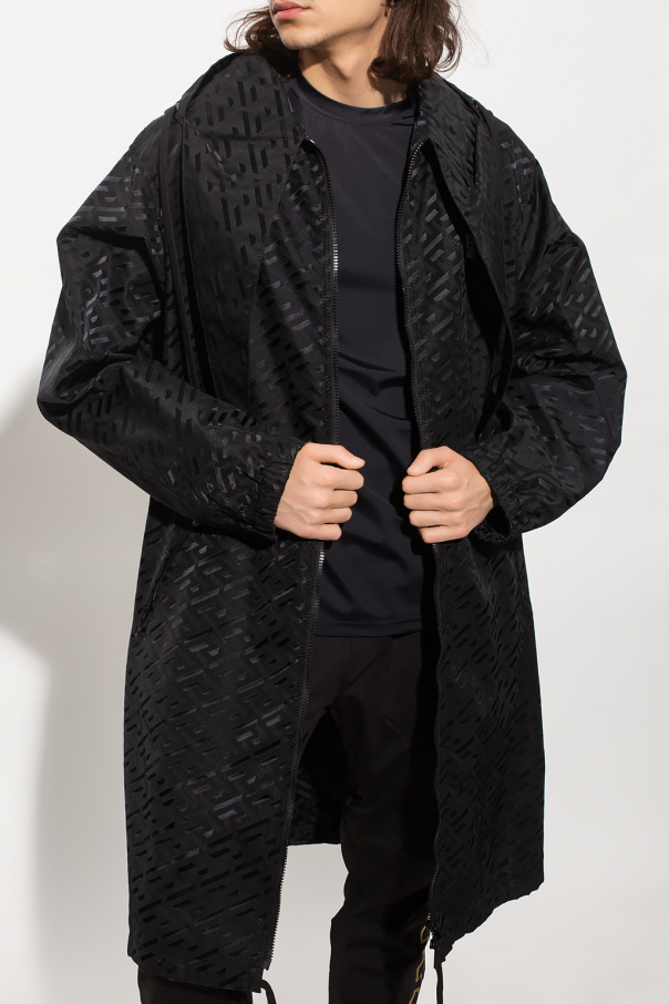 Black coat from Versace. Fastened with a two-way zip, this garment features a patch, logo pattern, drawstring hood with decorative trims, two zip pockets and long sleeves with ribbed cuffs.