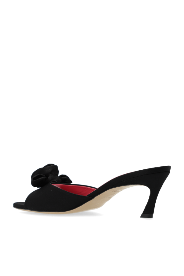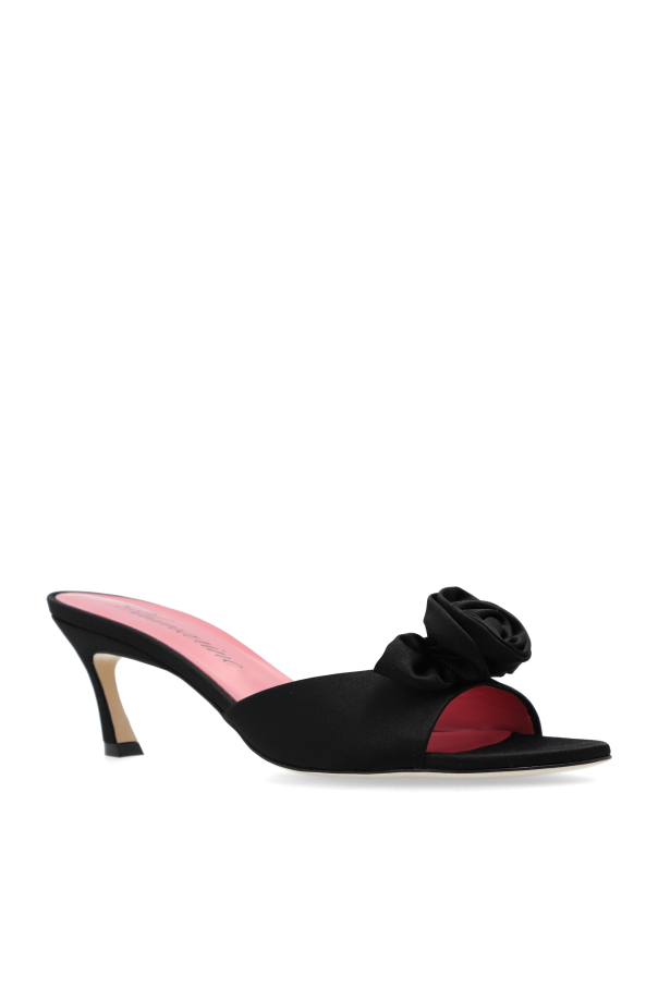 Introducing the \'Juliet\' satin mules from the exclusive Blumarine collection, a testament to sophisticated elegance and feminine allure. These mules, distinguished by their lustrous black satin and featuring a chic open design, are the epitome of luxury footwear. A single wide strap across the front, adorned with an exquisite satin bow, creates a captivating visual harmony. The mules stand on a medium-height, cone-shaped heel, ingeniously engineered to combine stability with grace. This innovative design ensures a comfortable stride without sacrificing the shoe\'s sleek silhouette. The interior insole, revealed in a contrasting hue of either pink or red, offers a delightful pop of color, while the beautifully scripted brand name signifies the luxury and craftsmanship inherent in the Blumarine heritage. Adding to its unique charm, the \'Juliet\' model is embellished with a decorative rose at the front, blending romantic elements with contemporary design to create a piece that is both timeless and of the moment. Why Purchase This Product? Elegance and sophistication embodied in footwear. Stability and comfort provided by the cone-shaped heel. Luxurious materials and exquisite craftsmanship. Unique design elements such as the satin bow and decorative rose, setting these mules apart. An exclusive piece from the renowned designer Blumarine, ensuring authenticity and high fashion status.