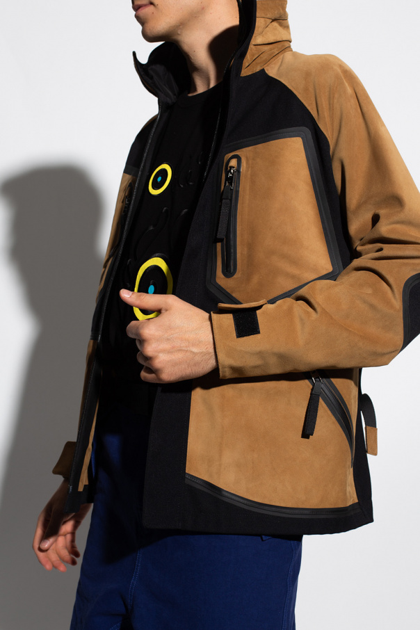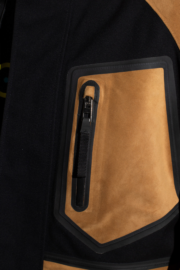 Black and brown jacket with a standing collar from Loewe. Crafted from different panels taped together, this style features a zipper, a velcro closure, long sleeves, four zipped pockets and distinctive leather inserts.