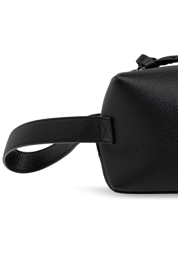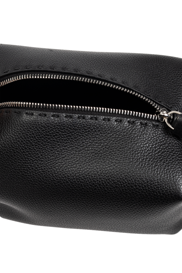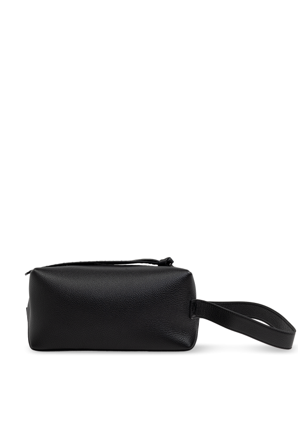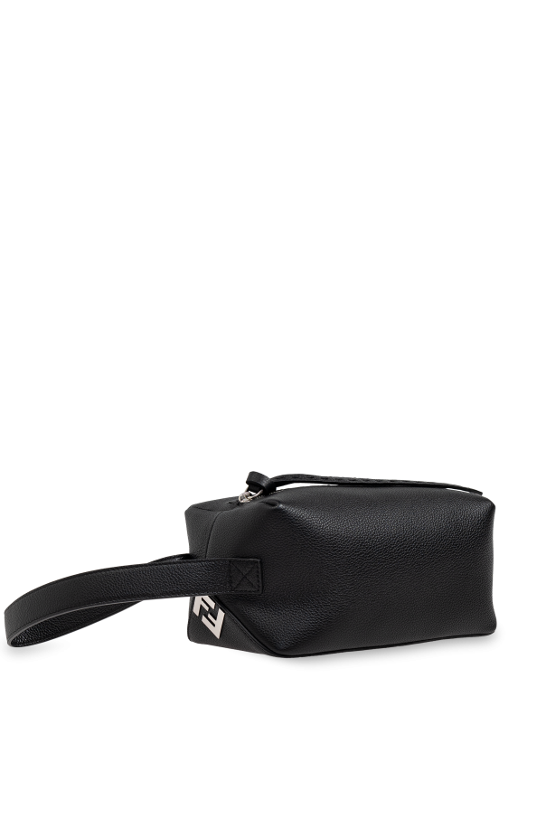 Behold the epitome of sophistication with this Black Leather Toiletry Bag by Fendi, the prestigious Italian fashion house renowned for its unwavering commitment to luxury and innovation. This exquisite accessory merges minimalism with functionality, making it a quintessential addition to any discerning individual\'s collection. Crafted from the finest quality leather with a smooth, grainy texture, this rectangular toiletry bag features elegantly rounded edges and an understated design devoid of superfluous embellishments. The robustness of the leather ensures durability, while the sleek finish exudes a timeless charm. The bag is equipped with a resilient metal zipper closure, accentuated by a polished metal pull, which not only enhances its aesthetic appeal but also guarantees secure storage. A sturdy side handle, also made of leather, facilitates effortless carrying, adding to its practicality. The subtle metal logo on the side signifies its exclusive Fendi lineage. Inside, the bag offers a spacious compartment, ideal for accommodating essential toiletries, whether for travel or daily use. The meticulous construction and refined details underscore Fendi\'s legacy of excellence. Why Choose This Product? Exquisite Craftsmanship: Made from premium leather with meticulous attention to detail. Functional Elegance: Spacious interior perfect for essential toiletries. Reliable Closure: Durable metal zipper with a polished finish. Exclusive Branding: Subtle metal logo indicating Fendi\'s luxury heritage. Practical Design: Convenient side handle for easy portability.