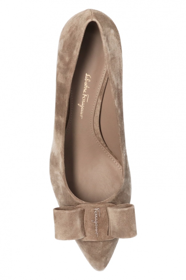 Grey ‘Viva’ pumps from Salvatore Ferragamo. Made of suede, this pair sits on a grey leather sole and showcases a bow detail with a tactile logo plaque on the front.