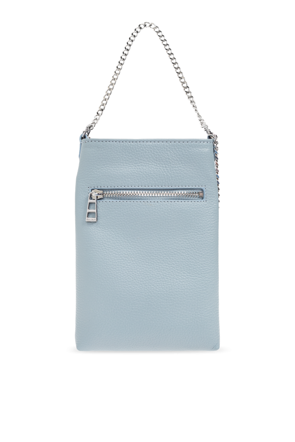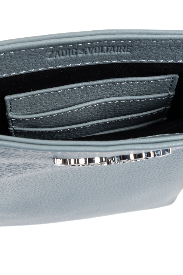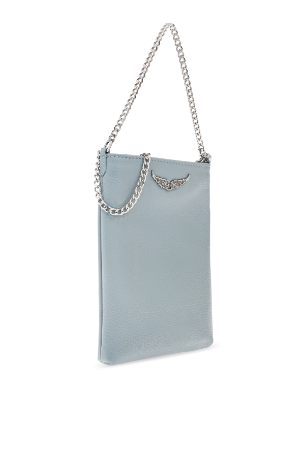 Introducing the Phone Case with Chain by Zadig & Voltaire, an epitome of modern elegance and functionality. This rectangular case, crafted from exquisite cowhide leather, showcases a delicate texture in hues of light blue and gray. The front is adorned with a sophisticated metal wing motif, adding a touch of luxury that resonates with the brand\'s heritage. Designed for the discerning individual, this phone case features a silver chain strap, perfect for shoulder wear, seamlessly blending with both casual and elegant attires. The back reveals a convenient zippered pocket for essentials, while the interior boasts compartments for your phone and three card slots, embossed with the iconic \"ZADIG & VOLTAIRE\" logo. Why Choose This Product? Chic and versatile accessory for any wardrobe. Crafted from premium cowhide leather for durability and style. Elegant metal embellishments and silver chain enhance its luxury appeal. Functional design with secure storage options.