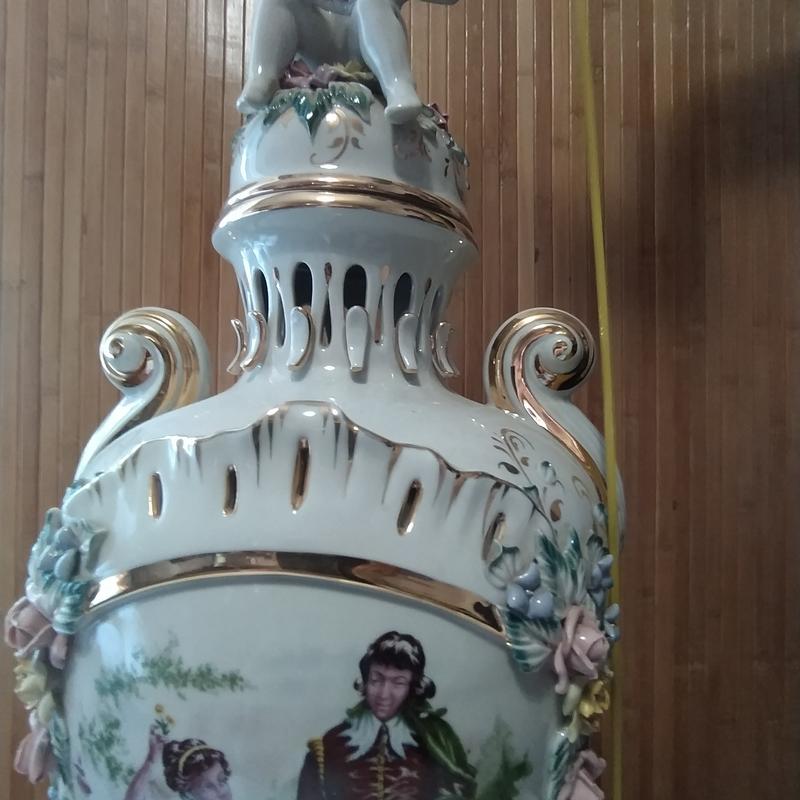 Произведение искусства . Уникальная ваза, очень редкая . Фарфоровая ваза с крышкой. Фигурка Пути, лепнина - фарфоровые цветы, галантгая сцена , роспись золотом , прорезной фарфор.