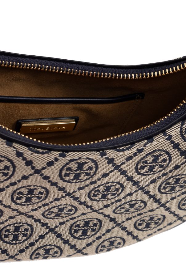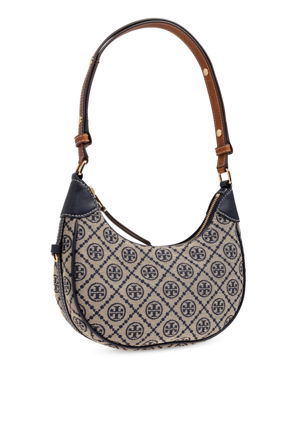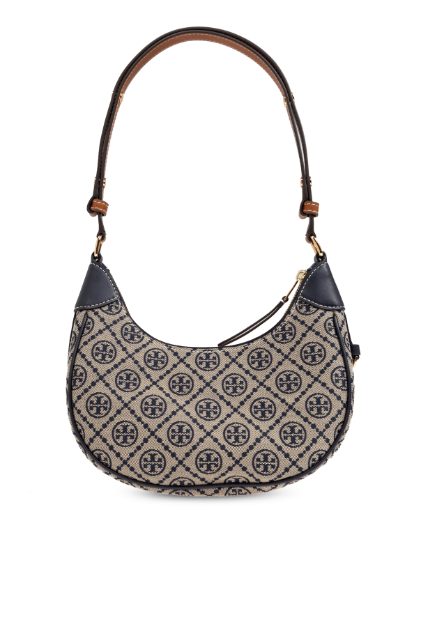 Discover the epitome of sophistication with the T-Monogram Shoulder Bag from the illustrious Tory Burch. This exquisite bag, designed in the shape of a crescent, exudes both elegance and modernity. Adorned with a repeating monogram pattern, this bag speaks to the brand\'s prestigious heritage. Crafted from high-quality, densely woven fabric, it promises durability and refined aesthetics. Intricate leather inserts in a rich navy hue grace the corners and handles, complemented by gleaming gold-tone metal accents, including the zipper and buckles, which underscore its exclusivity. The interior features a meticulously placed metal plaque bearing the brand\'s name, affirming its authenticity. The adjustable shoulder strap, in a sophisticated brown with navy accents, ensures versatile wearability. Additionally, the bag\'s interior offers a zippered pocket for effortless organization. Why Choose This Product? Elegant Design: Crescent shape with a luxurious monogram pattern. Premium Materials: High-quality fabric and leather details. Exclusive Accents: Gold-tone metal elements for a touch of opulence. Authenticity: Branded metal plaque inside. Versatile Functionality: Adjustable strap and convenient interior pocket.