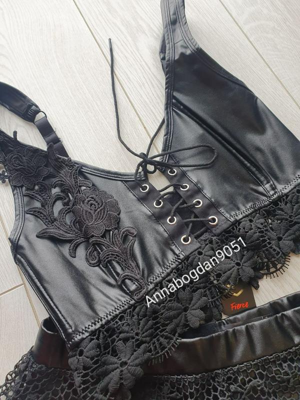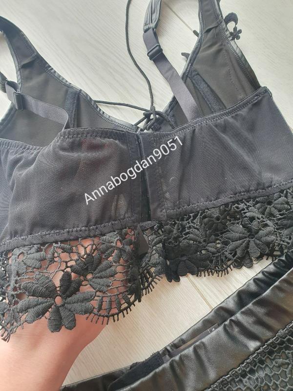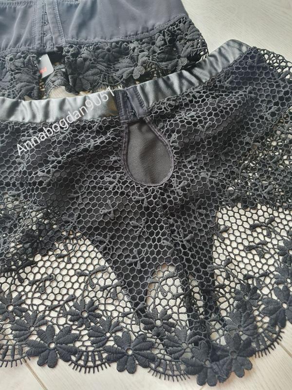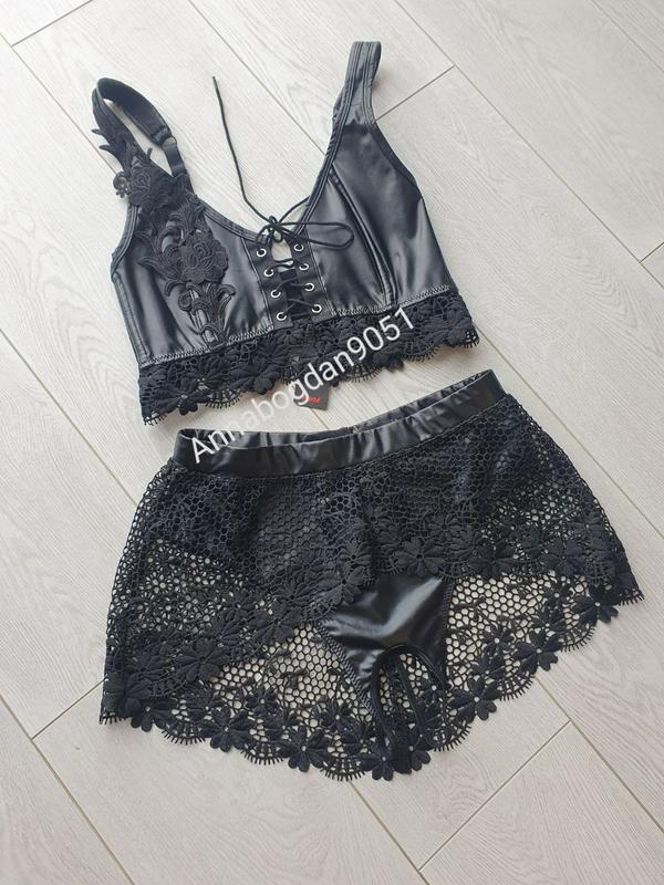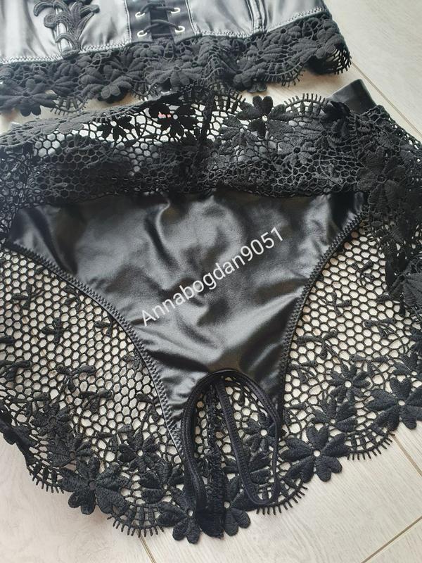 Шикарний набір, ТОП якість. Трусики-спідниця з відкритим доступом. Заміри: Об'єм бюст 72 см, тягнеться до 90 см. Трусики ПОТ 35-45 см( регулюються застібки + тягнуться). По бірці L, підійде і на М. На додаткові питання з радістю відповім в особистих повідомленнях.