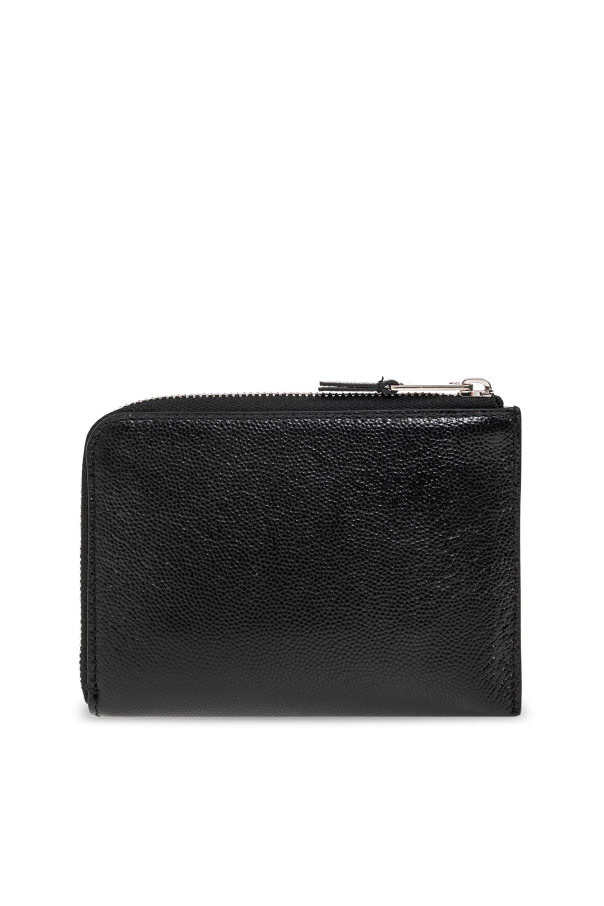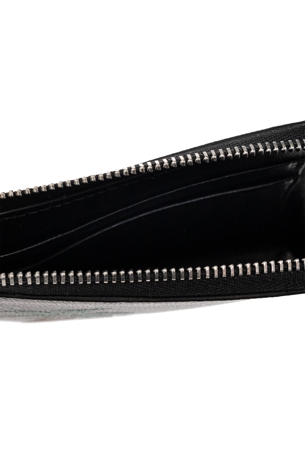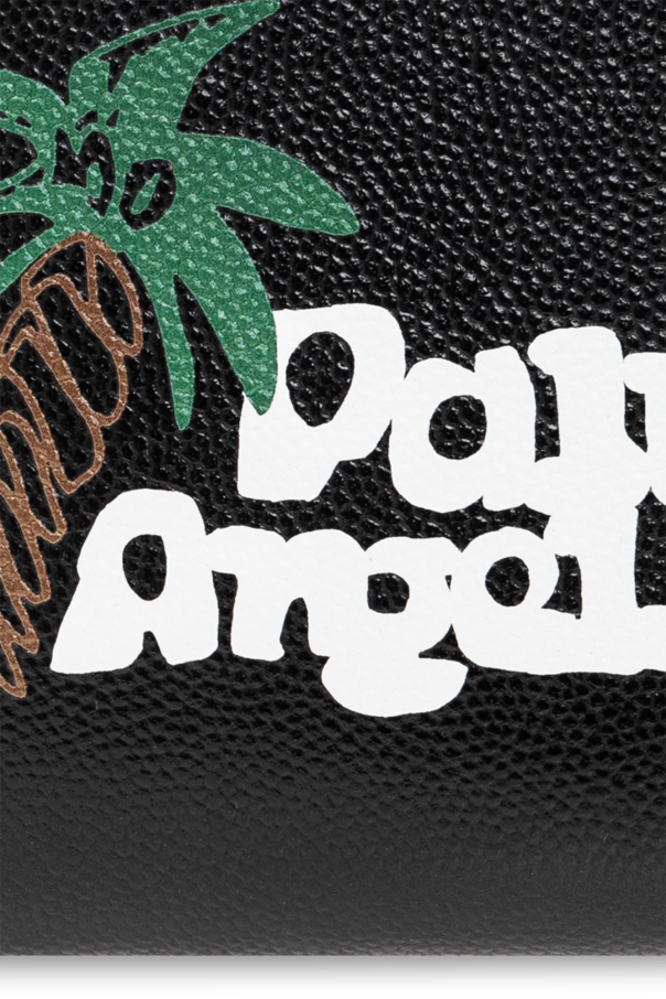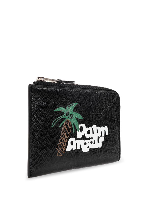 Black wallet from Palm Angels. Made of calf leather, this item features a zip fastening, white, green and brown logo print and one internal compartment with four card slots.