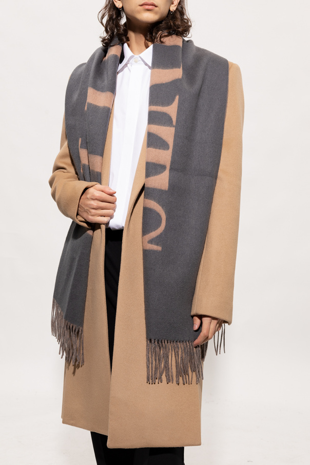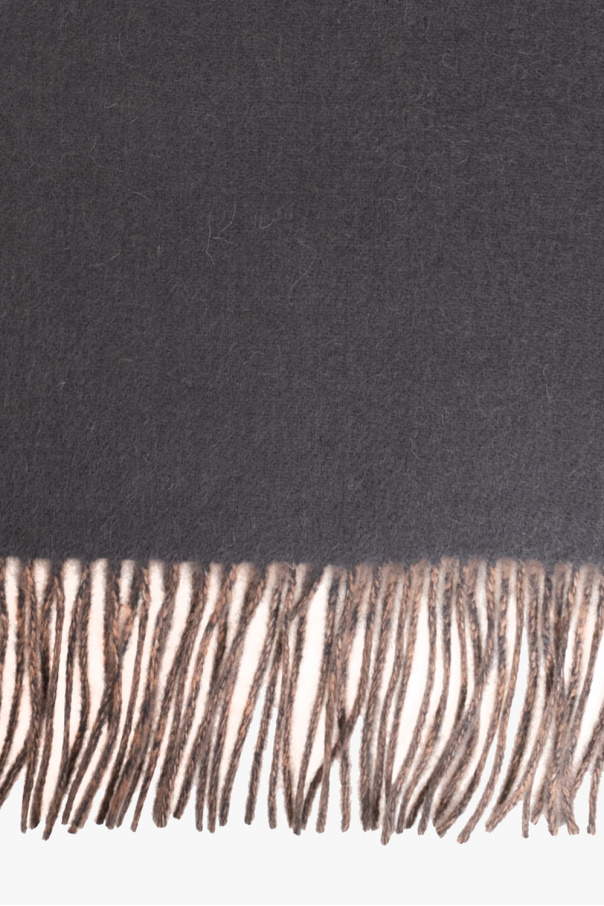 Grey reversible scarf from AllSaints. Made of wool, this item showcases the brand\'s logo and two fringed ends.