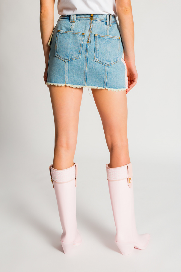 Short, blue denim skirt from Balmain. Fastened with a back zip, this design features tweed inserts in pink and white, metal logo buttons, two back pockets and gold-tone metal hardware.