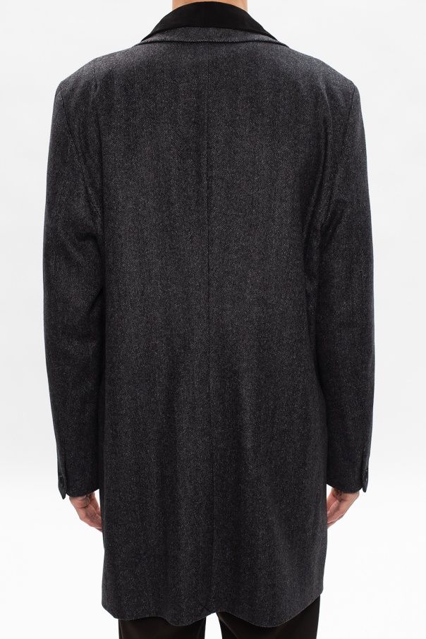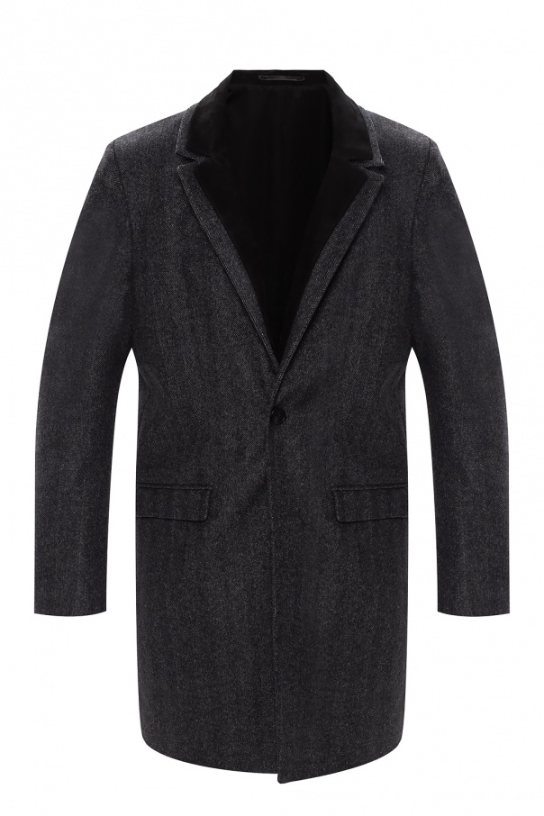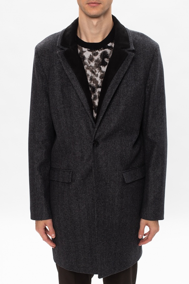 Black and grey ‘Morden’ coat from AllSaints. Fastened with a button, this long sleeve design features a herringbone pattern, two front flap pockets and a single rear vent.