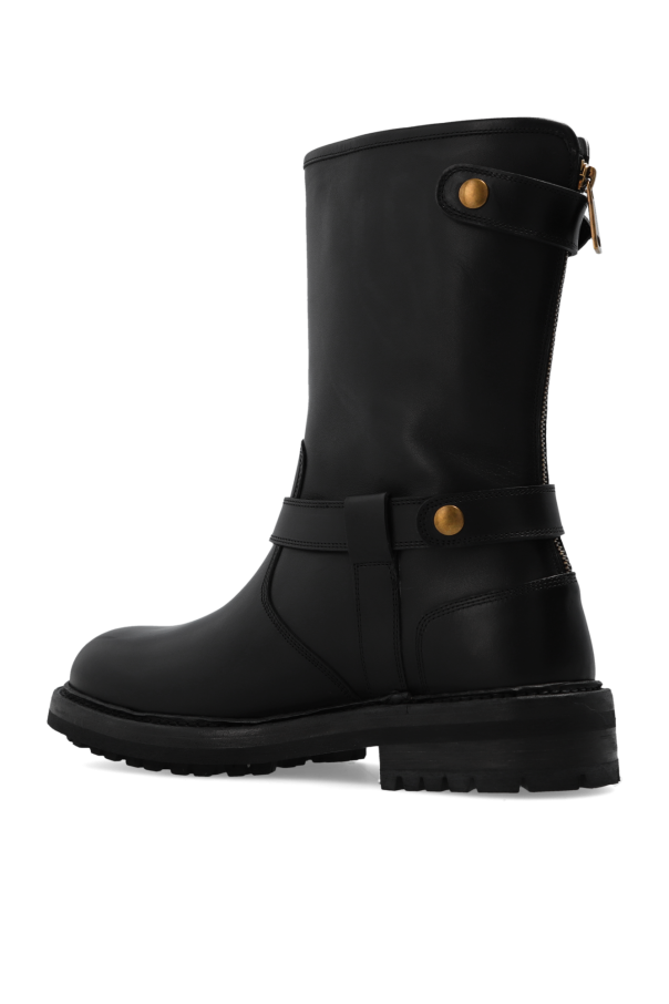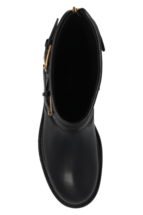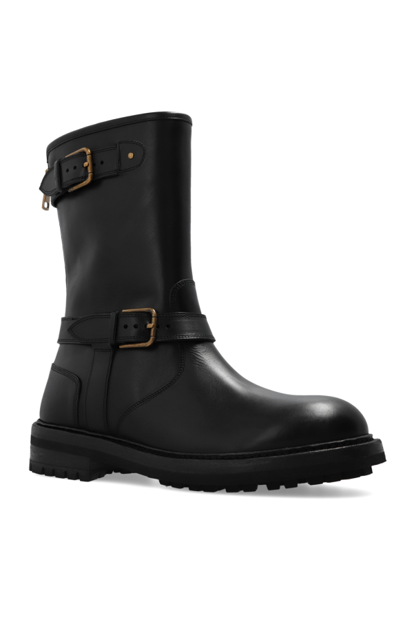Black biker boots from Dolce & Gabbana. Crafted from smooth leather, this pair features a zip at the back, two adjustable buckle straps to the side, antique gold-tone metal hardware and a black rubber sole.