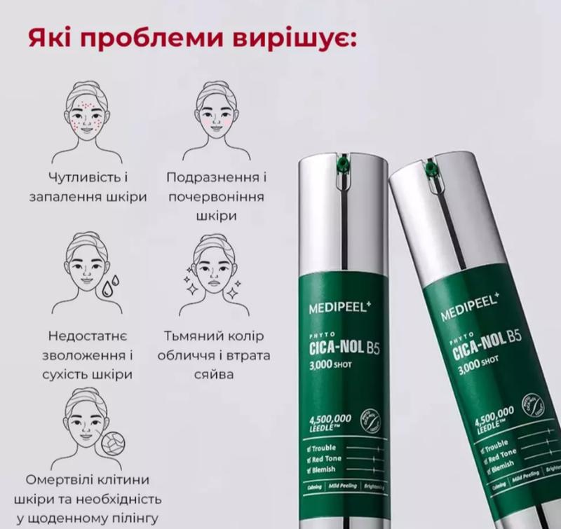 Пилинг-сыворотка MEDIPEEL Phyto Cica-Nol B5 3000 Shot Serum обеспечивает деликатное обновление, разглаживает текстуру кожи, успокаивает и увлажняет, смягчает шелушащиеся и огрубевшие участки. Предотвращает закупорки пор, появление воспалений и черных точек. Выравнивает тон, уменьшает выраженность пигментации и возрастных изменений. Содержит особую технологию Phyto Cica-Nol LeedleTM, которая состоит из очищенных спикул, комбинированных с экстрактом центеллы — такая технология позволяет спикулам работать максимально эффективно и транспортировать центеллу глубоко в кожу, при этом снижает вероятность раздражения. Дополнительные действующие компоненты: Cica-Nol B5 - запатентованный комплекс, состоит из экстракта центеллы азиатской, мадекассосида, мадекасовой кислоты, азиатической кислоты, азиатикозида и пантенола. Снимает раздражение и покраснение, снижает чувствительность. Салициловая BHA кислота - жирорастворимая кислота. Очищает поры, осветляет черные точки и сальные нити, предотвращает закупорки пор и появление воспалений, уменьшает жирность кожи. AquaxylTM комбинация глюкозы и ксилита. Увлажняет и восстанавливает, предотвращает трансэпидермальную потерю влаги, устраняет обезвоживание, борется с шелушениями, смягчает и разглаживает. Янтарная кислота оказывает антисептическое действие, матирует, уменьшает жирный блеск, улучшает клеточное дыхание, ускоряет метаболизм, активирует регенерацию и обновление. SingGreen - комплекс из экстрактов папайи, яблока, винограда и сливы. Мягко отшелушивает, выравнивает тон и разглаживает. Ниацинамид (витамин B3) замедляет доставку меланина к эпидермису, за счет чего предотвращается образование пигментных пятен. Снижает чувствительность к внешним раздражителям, выравнивает тон, способствует производству коллагена и повышению плотности. Экстракт инжира содержит особый энзим фицин – вещество, которое очищает, деликатно отшелушивает роговой слой, выравнивает тон и стимулирует обновление, не провоцирует раздражения. Подходит для комбинированной, проблемной и чувствительной кожи. Способ применения: нанесите сыворотку на лицо сразу после умывания, или после тонизирования. После впитывания нанесите увлажняющий крем. Подходит для ежедневного применения.
