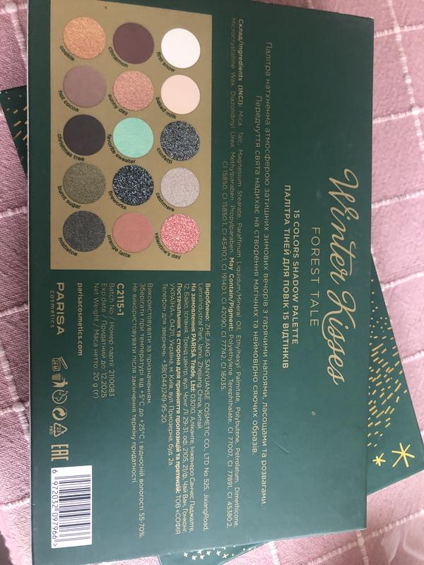 Новая палетка, сами тени в идеальном состоянии, нюанс - разбитое зеркало Особенности Parisa Cosmetics Winter Kisses Eyeshadow Palette: - палетка Ice Love: 6 матовых оттенков (Frosty Morning, First Ice, Peach Pie, Berry Tea, Kissed Cheeks, Mulled Wine), 1 дуохром (Angel), 3 сатиновых (Lollipop), 3 металлика (Plim Jam, Holiday, Silver Lake), 1 голографический глитер (Sparklers), шиммершимерop), 3 металлика (Plim) (Plim Jame (Blizzard); - палетка Forest Tale: 4 матовых (Baked Milk, Cinnamon, Hot Cocoa, Christmas Tree), 2 дуохромы (Confetti, Valentine's Day), 3 сатиновых (Cashemire, Burnt Sugar, Mistletoe), 3 металла (Sunny Day, Favorie ), 1 глиттер (Firews), топпер Sstnow), 1 (Fir Sstnow). велюровый матовый (Orange Latte). - тени помогают создать праздничный или изысканный макияж в прохладной или нейтральной гамме; - насыщенная пигментация позволяет получать оттенки любой глубины; - тени равномерно ложатся на кожу, не оставляют пятен и легко растушевываются; - блестящие оттенки хорошо сочетаются друг с другом.
