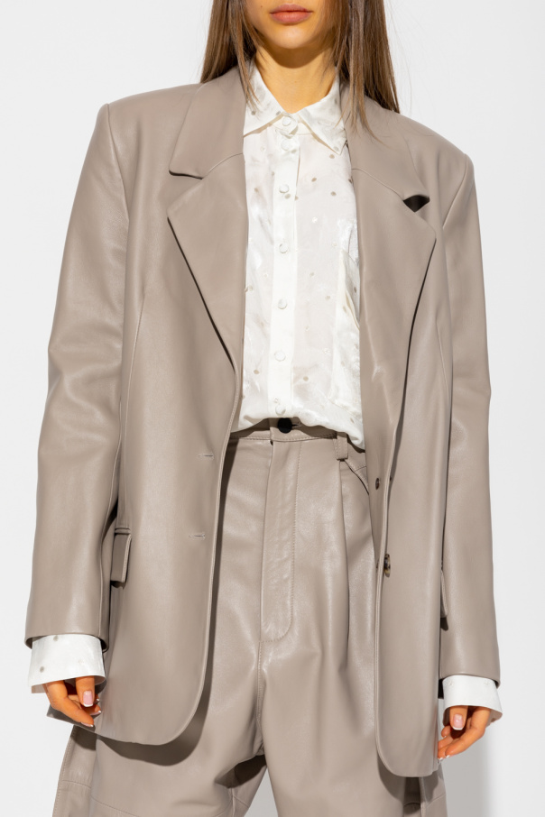 Long, greyish beige ‘Lille’ blazer from The Mannei. Made of leather, this garment features button fastenings, notch lapels, two front flap pockets and slits at the long sleeves and back.