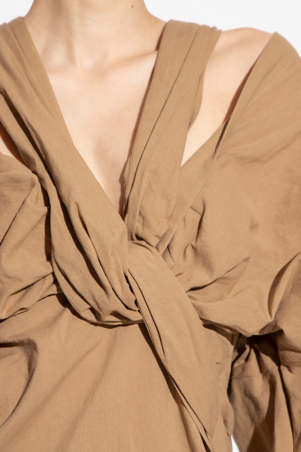 Brown ‘Agui’ dress from Jacquemus. Made of cotton, this design features a concealed side zip, fitted skirt, plunging neckline with a collar, decorative knot and draped fabric as well as long, wide sleeves with buttoned cuffs.