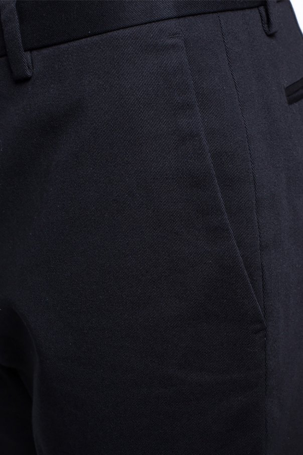 Black cotton trousers from Gucci. Zip and button fastenings. Stitched red logo at rear. 2 inset pockets at front. 2 button fastening pockets at rear. Tapered legs.