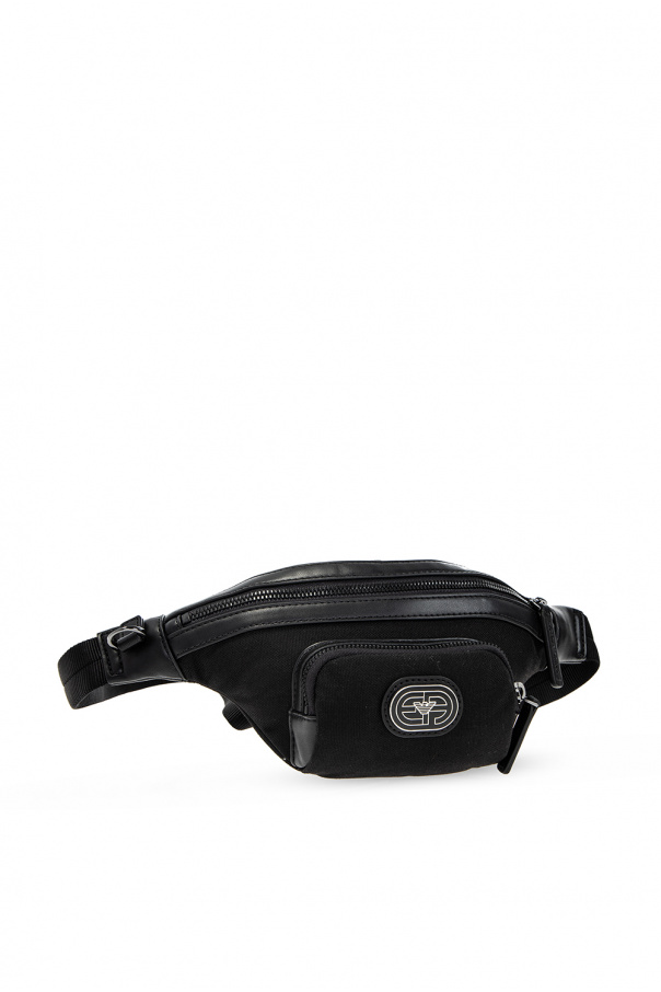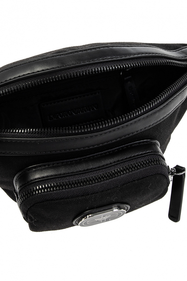 Black belt bag from Emporio Armani. Finished with faux-leather, this design features a zip-around fastening, a tactile appliqué with metal logo lettering in black and silver-tone, a zip pocket on the front, an adjustable strap and an interior with a zip pocket.
