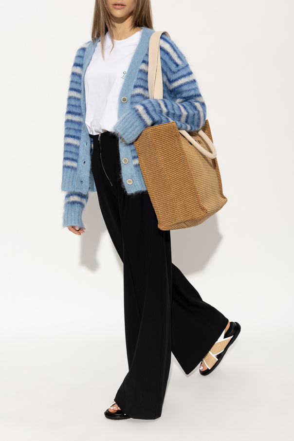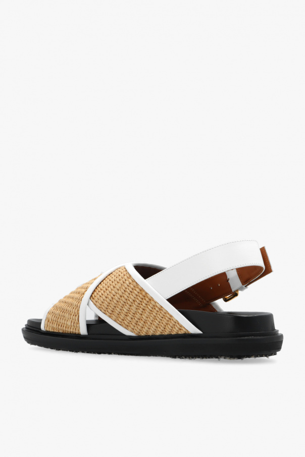 Beige and white ‘Fussbett’ sandals from Marni. Crafted from woven jute and trimmed leather, this model features an adjustable buckle strap with a logo print, gold-tone metal hardware and a black rubber sole with a jute overlay.