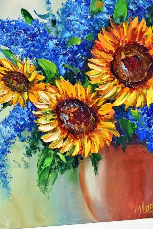 Яркая картина с подсолнухами для уютного интерьера . Живопись написана в 2023 году, масляными красками на оргалите, размер 25х35, с помощью мастихина. Цветы подсолнуха написаны пастозными мазками мастихином. Картины от начала до конца создаются мной вручную. Продается без оформления в раму. Есть предложения по оформлению в раму. При получении посылки нужно будет просто повесить оформленную работу на стену. Сделаю дополнительные фото. Отвечу на вопросы, пишите. Рекомендации по уходу: Картину протирать от пыли сухой тряпочкой.