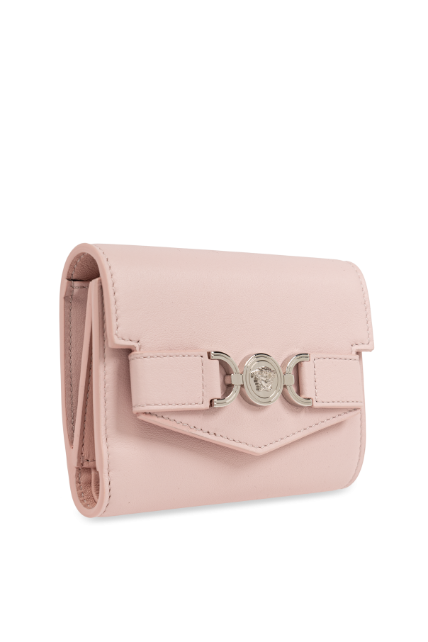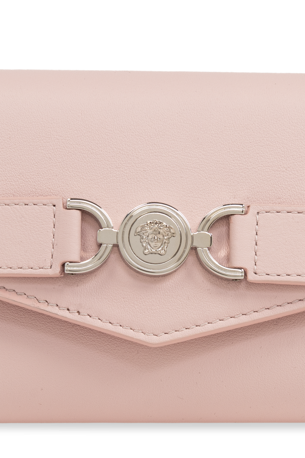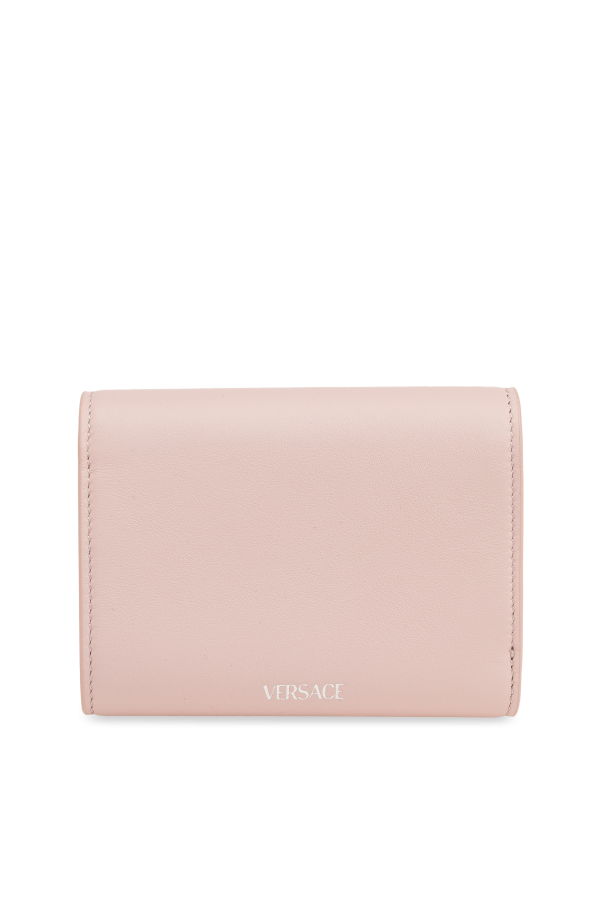 Introducing the epitome of sophistication and luxury: the Versace Leather Wallet. Crafted from the finest 100% leather, this exquisite accessory is a testament to the brand\'s commitment to quality and elegance. Its pastel pink hue exudes a soft, feminine charm, making it a standout piece in any ensemble. The wallet\'s design is both sleek and functional. It features a rectangular shape with rounded edges, complemented by a silver designer logo prominently displayed on a contrasting pink strap on the front flap. This emblem is not just a decorative element; it serves as a hallmark of Versace\'s renowned craftsmanship. The wallet\'s magnetic snap closure ensures your belongings are secure, yet easily accessible. Inside, the wallet reveals an array of compartments and slots designed for optimal organization. It houses six card slots, a space for bills, and a zippered compartment for coins, all rendered in the same charming pastel pink. The interior also bears the signature of the Versace brand, a subtle nod to its luxurious lineage. The wallet’s slim profile is highlighted in its three-dimensional view, showcasing its flat nature without compromising on space or style. A closer look at the central decorative logo reveals the meticulous attention to detail and the unique design characteristic of Versace, making this wallet not only an accessory but a piece of art. Why Purchase This Product? Elegant Design: A seamless blend of functionality and fashion, featuring a sleek shape and the iconic Versace logo. Premium Material: Crafted from 100% high-quality leather for durability and a luxurious feel. Organizational Efficiency: Equipped with multiple slots and compartments for cards, bills, and coins. Signature Versace Luxury: Each detail, from the color to the decorative logo, reflects the brand\'s prestigious design ethos.