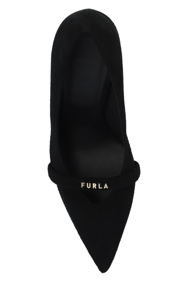 Black ‘Core’ pumps from Furla. Made of suede with a pointed toe silhouette, this model sits on a black rubber sole and showcases a strap and gold-tone logo hardware on the front.